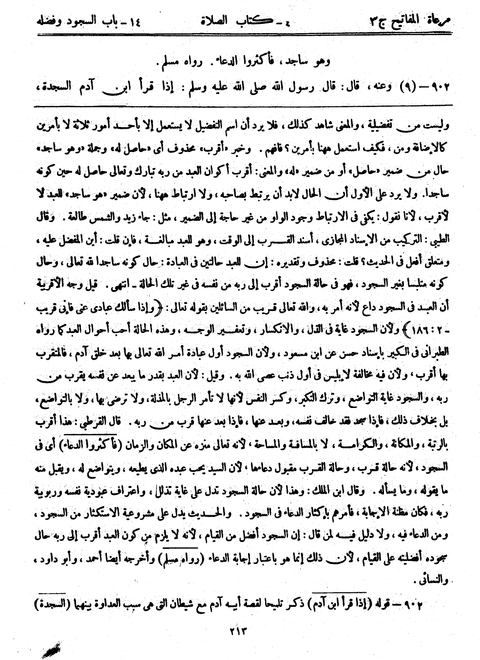 902- قوله: (إذا قرأ ابن آدم) ذكر تلميحاً لقصة أبيه آدم مع الشيطان التي هي سبب العداوة بينهما. (السجدة)