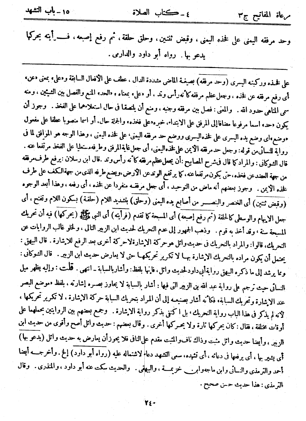 على فخذه وركبته اليسرى. (وحد مرفقة) بصيغة الماضي مشددة الدال، عطف على الأفعال السابقة و"على" بمعنى "عن"، أي رفع مرفقه عن فخذه، وجعل عظم مرفقه كأنه رأس وتد، أو "على" بمعناه و"الحد" المنع والفصل بين الشيئين، ومنه سمي المناهي حدود الله. والمعنى: فصل بين مرفقه وجنبه، ومنع أن يلتصقا في حال استعلائهما على الفخذ. وجوز أن يكون "حد" اسماً مرفوعاً مضافاً إلى المرفق على الابتداء، خبره "على فخذه" والجملة حال، أو اسما منصوباً عطفاً على مفعول "وضع" أي وضع يده اليسرى على فخذه اليسرى ووضع حد مرفقه اليمنى، على فخذه اليمنى، وهذا الوجه هو الموافق لما في رواية للنسائي من قوله: وجعل حد مرفقه الأيمن على فخذه اليمنى، أي جعل غاية المرفق وطرفه مستعلياً على الفخذ مرتفعاً عنه. قال الشوكاني: والمراد كما قال في شرح المصابيح: أن يجعل عظم مرفقه كأنه رأس وتد. قال ابن رسلان: يرتفع طرف مرفقه من جهة العضد عن فخذه، حتى يكون مرتفعاً عنه، كما يرتفع الوتد عن الأرض، ويضع طرفه الذي من جهة الكف على طرف فخذه الأيمن. وجوز بعضهم أنه ماض من التوحيد، أي جعل مرفقه منفرداً عن فخذه، أي رفعه، وهذا أبعد الوجوه. (وقبض ثنيتين) أي الخنصر والبنصر من أصابع يده اليمنى. (وحلق) بتشديد اللام. (حلقه) بسكون اللام وتفتح، أي جعل الإبهام والوسطى كالحلقة. (ثم رفع إصبعه) أي المسبحة كما تقدم. (فرأيته) أي النبي - صلى الله عليه وسلم -. (يحركها) فيه أن تحريك المسبحة سنة، وقد أخذ به قوم. وذهب الجمهور إلى عدم التحريك لحديث ابن الزبير التالي، ولخلو غالب الروايات عن التحريك، قالوا: والمراد بالتحريك في حديث وائل هو حركة الإشارة لا حركة أخرى بعد الرفع للإشارة. قال البيهقي: يحتمل أن يكون مراده بالتحريك الإشارة بها لا تكرير تحريكها حتى لا يعارض حديث ابن الزبير. قال الشوكاني: ومما يرشد إلى ما ذكره البيهقي رواية أبي داود لحديث وائل، فإنها بلفظ: وأشار بالسبابة- انتهى. قلت: وإليه يظهر ميل النسائي حيث ترجم على رواية عبد الله بن الزبير التي فيها: أشار بالسبابة لا يجاوز بصره إشارته، بلفظ "موضع البصر عند الإشارة وتحريك السبابة" فكأنه أشار بصنيعه إلى أن المراد بتحريك السبابة حركة الإشارة، لا تكرير تحريكها؛ لأنه لم يذكر في هذا الباب رواية التحريك، بل اكتفى بذكر رواية الإشارة. وجمع بعضهم بين الروايتين بحملهما على أوقات مختلفة، فقال: كان يحركها تارة ولا يحركها أخرى. وقال بعضهم: حديث وائل أصح وأقوى من حديث ابن الزبير، وأيضاً حديث وائل مثبت وذاك ناف والمثبت مقدم على النافي فلا يجوز أن يعارض به حديث وائل. (يدعو بها) أي يشير بها، أي يرفعهما في دعائه، أي تشهده، سمي التشهد دعاء لاشتماله عليه. (رواه أبوداود) إلخ. وأخرجه أيضاً أحمد والترمذي والنسائي وابن ماجه وابن خزيمة، والبيهقي. والحديث سكت عنه أبوداود، والمنذري. وقال الترمذي: هذا حديث حسن صحيح.