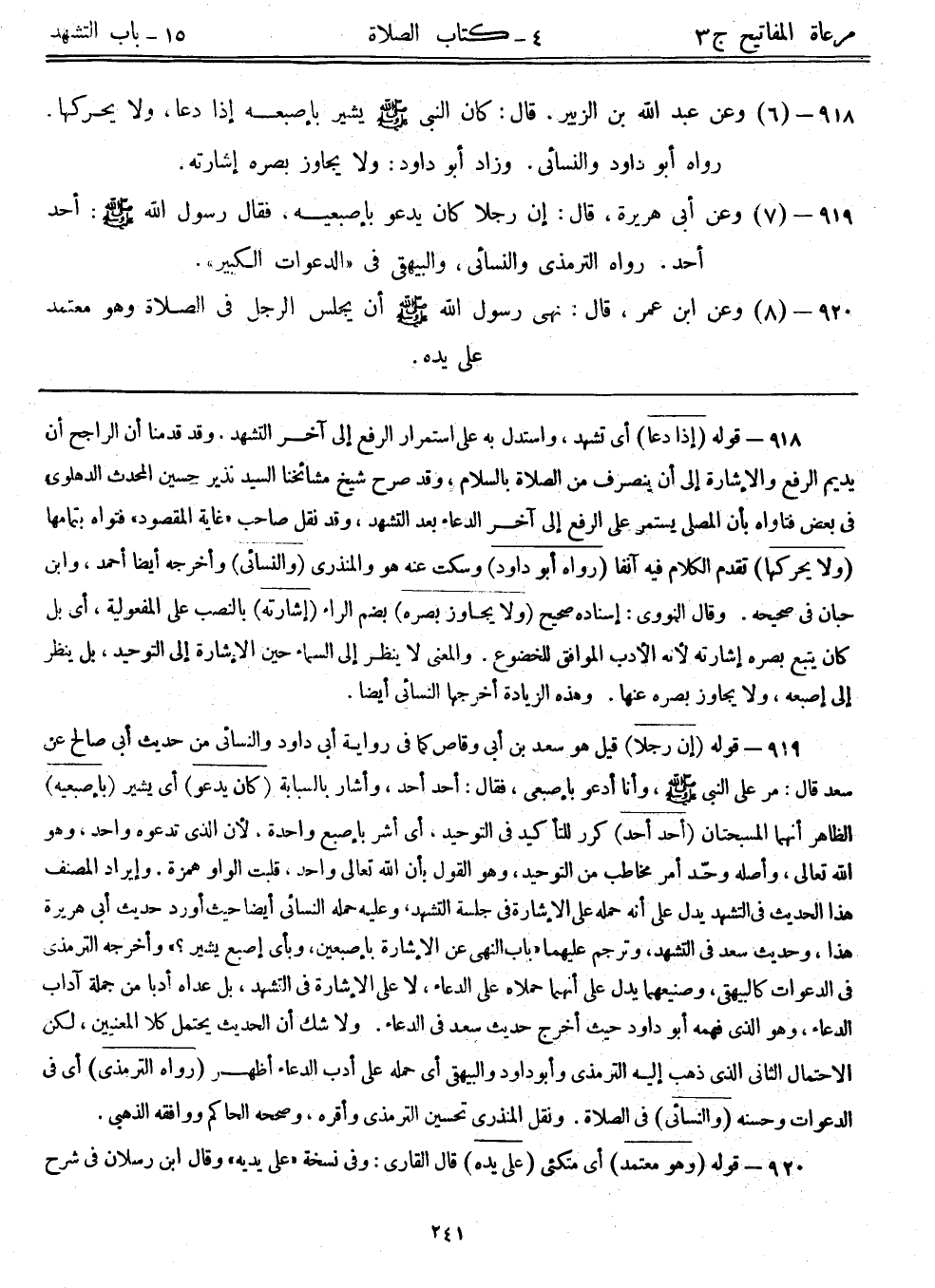 918- (6) وعن عبد الله بن الزبير. قال: ((كان النبي - صلى الله عليه وسلم - يشير بإصبعه إذا دعا، ولا يحركها)) رواه أبوداود والنسائي. وزاد أبوداود: ولا يجاوز بصره إشارته.