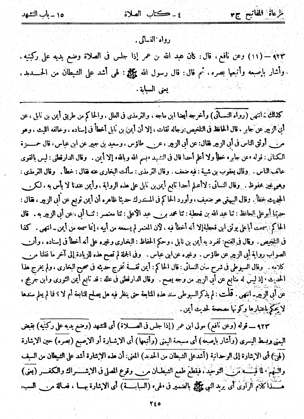 923- قوله: (وعن نافع) مولى ابن عمر. (إذا جلس في الصلاة) أي للتشهد. (وضع يديه على ركبتيه) بقبض اليمنى وبسط اليسرى. (وأشار بإصبعه) أي مسبحة اليمنى. (وأتبعها) أي الإشارة أو الإصبع. (بصره) حين الإشارة. (لهي) أي الإشارة إلى الوحدانية. (أشد على الشيطان من الحديد) المعنى: أن هذه الإشارة أشد على الشيطان من السيف والسهم، لما فيه من التوحيد، فيقطع طمع الشيطان من وقوع المصلي في الإشراك والكفر. (يعني) هذا كلام الراوي أي يريد النبي - صلى الله عليه وسلم - بالضمير في "لهي". (السبابة) أي الإشارة بها، فعالة من السب،
