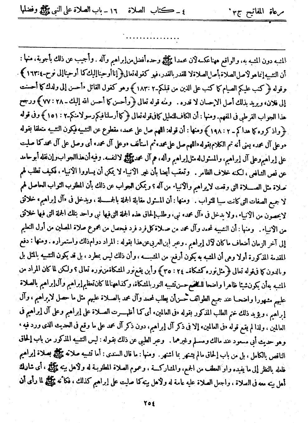 المشبه دون المشبه به، والواقع ههنا عكسه؛ لأن محمداً - صلى الله عليه وسلم - وحده أفضل من إبراهيم وآله. وأجيب عن لك بأجوبة، منها: أن التشبيه إنما هو لأصل الصلاة بأصل الصلاة لا للقدر بالقدر، فهو كقوله تعالى: {إنا أوحينا إليك كما أوحينا إلى نوح} [4: 163] وقوله: {كتب عليكم الصيام كما كتب على الذين من قبلكم} [2: 183] وهو كقول القائل: "أحسن إلى ولدك كما أحسنت إلى فلان"، ويريد بذلك أصل الإحسان لا قدره. ومنه قوله تعالى: {وأحسن كما أحسن الله إليك} [28: 77] ورجح هذا الجواب القرطبي في المفهم. ومنها: أن الكاف للتعليل كما في قوله تعالى: {كما أرسلنا فيكم رسولاً منكم} [2: 151] وفي قوله: {واذكروه كما هداكم} [2: 198] . ومنها: أن قوله: اللهم صل على محمد، مقطوع عن التشبيه فيكون التشبيه متعلقاً بقوله: "وعلى آل محمد". يعني أنه تم الكلام بقوله" اللهم صل على محمد" ثم استأنف"وعلى آل محمد" أي وصل على آل محمد كما صليت على إبراهيم وعلى آل إبراهيم، والمسؤل له مثل إبراهيم وآله، هم آل محمد - صلى الله عليه وسلم - لا لنفسه. وفيه أن هذا الجواب وإن نقله أبوحامد عن نص الشافعي، لكنه خلاف الظامر. وتعقب أيضاً بأن غير الأنبياء لا يمكن أن يساووا الأنبياء، فكيف تطلب لهم صلاة مثل صلاة التي وقعت لإبراهيم والأنبياء من آله؟ ويمكن الجواب عن ذلك بأن المطلوب الثواب الحاصل لهم لا جميع الصفات التي كانت سبباً للثواب. ومنها: أن المسؤول مقابلة الجملة بالجملة، ويدخل في "آل إبراهيم" خلائق لا يحصون من الأنبياء، ولا يدخل في "آل محمد" نبي، وطلب إلحاق هذه الجملة التي فيها نبي واحد بتلك الجملة التي فيها خلائق من الأنبياء. ومنها: أن التشبيه لمحمد وآل محمد من صلاة كل فرد فرد فيحصل من مجموع صلاة المصلين من أول التعليم إلى آخر الزمان أضعاف ما كان لآل إبراهيم. وعبر ابن العربي عن هذا بقوله: المراد دوام ذلك واستمراره. ومنها: دفع المقدمة المذكورة أولاً وهي أن المشبه به يكون أرفع من المشبه، وأن ذلك ليس بمطرد، بل قد يكون التشبيه بالمثل بل وبالدون كما في قوله تعالى: {مثل نوره كمشكاة} [24: 35] . وأين يقع نور المشكاة من نوره تعالى؟ ولكن لما كان المراد من المشبه به أن يكون شيئاً ظاهراً واضحاً للسامع حسن تشبيه النور بالمشكاة، وكذا ههنا لما كان تعظيم إبراهيم وآل إبراهيم بالصلاة عليهم مشهوراً واضحاً عند جميع الطوائف حسن أن يطلب لمحمد وآل محمد بالصلاة عليهم مثل ما حصل لإبراهيم وآل إبراهيم، ويؤيد ذلك ختم الطلب المذكور بقوله "في العالمين"، أي كما أظهرت الصلاة على إبراهيم وعلى آل إبراهيم في العالمين، ولذا لم يقع قوله "في العالمين" إلا في ذكر آل إبراهيم، دون ذكر آل محمد على ما وقع في الحديث الذي ورد فيه، وهو حديث أبي مسعود عند مالك ومسلم وغيرهما. وعبر الطيبي عن ذلك بقوله: ليس التشبيه المذكور من باب إلحاق الناقص بالكامل، بل من باب إلحاق ما لم يشتهر بما اشتهر. ومنها: ما قال السندي: أما تشبيه صلاته - صلى الله عليه وسلم - بصلاة إبراهيم فلعله بالنظر إلى ما يفيده واو العطف من الجمع والمشاركة، وعموم الصلاة المطلوبة له ولأهل بيته - صلى الله عليه وسلم -، أي شارك أهل بيته معه في الصلاة، واجعل الصلاة عليه عامة له ولأهل بيته كما صليت على إبراهيم كذلك، فكأنه - صلى الله عليه وسلم - لما رأى أن