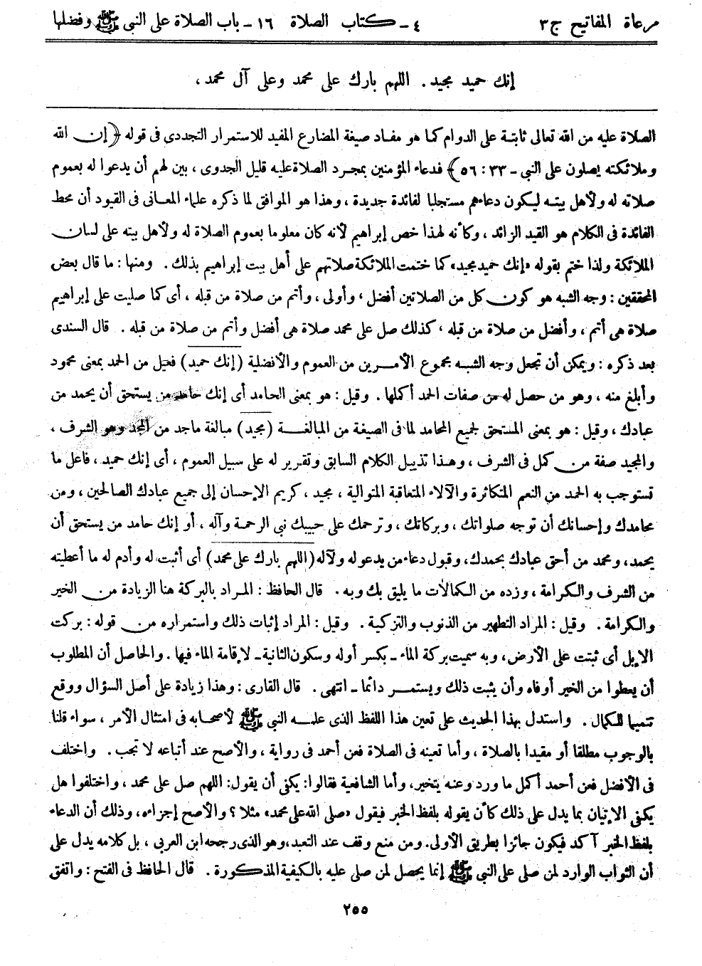 الصلاة عليه من الله تعالى ثابتة على الدوام كما هو مفاد صيغة المضارع المفيد للاستمرار التجددي في قوله: {إن الله وملائكته يصلون على النبي} [33: 56] فدعاء المؤمنين بمجرد الصلاة عليه قليل الجدوى، بين لهم أن يدعوا له بعموم صلاته له ولأهل بيته ليكون دعاءهم مستجلباً لفائدة جديدة، وهذا هو الموافق لما ذكره علماء المعاني في القيود أن محط الفائدة في الكلام هو القيد الزائد، وكأنه لهذا خص إبراهيم؛ لأنه كان معلوماً بعموم الصلاة له ولأهل بيته على لسان الملائكة، ولذا ختم بقوله: "إنك حميد مجيد"، كما ختمت الملائكة صلاتهم على أهل بيت إبراهيم بذلك. ومنها: ما قال بعض المحققين: وجه الشبه هو كون كل من الصلاتين أفضل وأولى وأتم من صلاة من قبله، أي كما صليت على إبراهيم صلاة هي أتم، وأفضل من صلاة من قبله، كذلك صل على محمد صلاة هي أفضل وأتم من صلاة من قبله. قال السندي بعد ذكره: ويمكن أن تجعل وجه الشبه مجموع الأمرين من العموم والأفضلية. (إنك حميد) فعيل من الحمد بمعنى محمود وأبلغ منه، وهو من حصل له من صفات الحمد أكملها. وقيل: هو بمعنى الحامد أي إنك حامد من يستحق أن يحمد من عبادك، وقيل: هو بمعنى المستحق لجميع المحامد لما في الصيغة من المبالغة. (مجيد) مبالغة ماجد من المجد وهو الشرف، والمجيد صفة من كمل في الشرف، وهذا تذييل الكلام السابق وتقرير له سبيل العموم، أي إنك حميد، فاعل ما تستوجب به الحمد من النعم المتكاثرة والآلاء المتعاقبة المتوالية، مجيد، كريم الإحسان إلى جميع عبادك الصالحين، ومن محامدك وإحسانك أن توجه صلواتك، وبركاتك، وترحمك على حبيبك نبي الرحمة وآله، أو إنك حامد من يستحق أن يحمد، ومحمد من أحق عبادك بحمدك، وقبول دعاء من يدعوا له ولآله. (اللهم بارك على محمد) أي أثبت له وأدم له ما أعطيته من الشرف والكرامة، وزده من الكمالات ما يليق بك وبه. قال الحافظ: المراد بالبركة هنا الزيادة من الخير والكرامة. وقيل: المراد التطهير من الذنوب والتزكية. وقيل: المراد إثبات ذلك واستمراره من قوله: بركت الإبل أي ثبتت على الأرض، وبه سميت بركة ماء- بكسر أوله وسكون الثانية- لإقامة الماء فيها. والحاصل أن المطلوب أن يُعطوا من الخير أوفاه وأن يثبت ذلك ويستمر دائماً-انتهى. قال القاري: وهذا زيادة على أصل السؤال ووقع تتميماً للكمال. واستدل بهذا الحديث على تعين هذا اللفظ الذي علمه النبي - صلى الله عليه وسلم - لأصحابه في امتثال الأمر، سواء قلنا بالوجوب مطلقاً أو مقيداً بالصلاة، وأما تعينه في الصلاة فعن أحمد في رواية، والأصح عند أتباعه لا تجب. واختلف في الأفضل فعن أحمد أكمل ما ورد وعنه يتخير، وأما الشافعية فقالوا: يكفي أن يقول: اللهم صل على محمد، واختلفوا هل يكفي الإتيان بما يدل على ذلك كأن يقوله بلفظ الخبر فيقول: "صلى الله على محمد" مثلاً؟ والأصح إجزاءه، وذلك أن الدعاء بلفظ الخبر آكد فيكون جائزاً بطريق الأولى. ومن منع وقف عند التعبد، وهو الذي رجحه ابن العربي، بل كلامه يدل على أن الثواب الوارد لمن صلى على النبي - صلى الله عليه وسلم - إنما يحصل لمن صلى عليه بالكيفية المذكورة. قال الحافظ في الفتح: واتفق