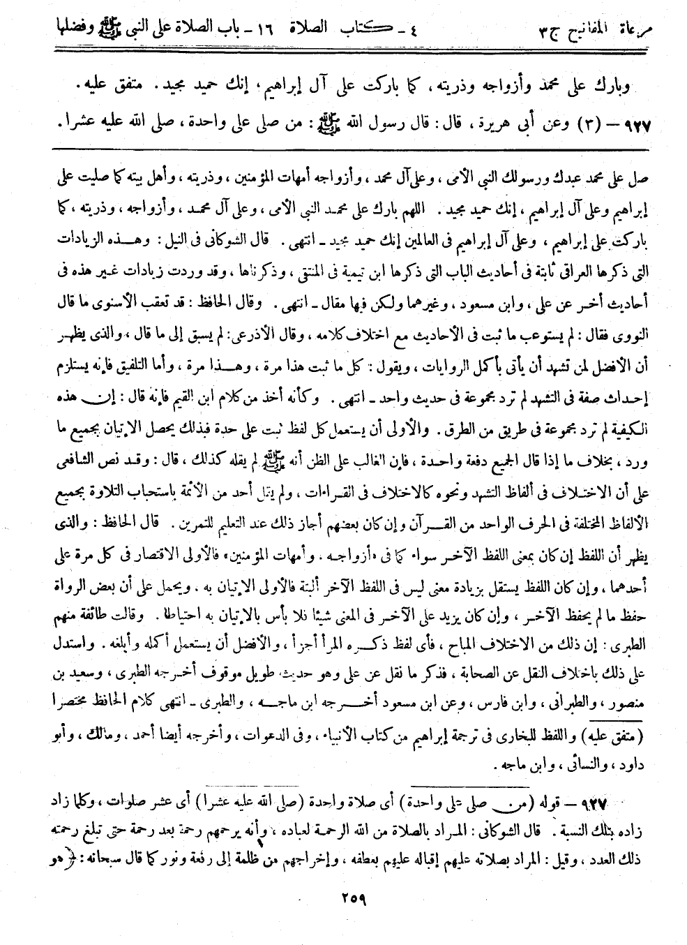 صل على محمد عبدك ورسولك النبي الأمي، وعلى آل محمد، وأزواجه أمهات المؤمنين، وذريته، وأهل بيته كما صليت على إبراهيم وعلى آل إبراهيم، إنك حميد مجيد. اللهم بارك على محمد النبي الأمي، وعلى آل محمد، وأزواجه، وذريته، كما باركت على إبراهيم، وعلى آل إبراهيم في العالمين إنك حميد مجيد- انتهى. قال الشوكاني في النيل: وهذه الزيادات التي ذكرها العراقي ثابتة في أحاديث الباب التي ذكرها ابن تيمية في المنتقى، وذكرناها، وقد وردت زيادات غير هذه في أحاديث أخر عن علي، وابن مسعود، وغيرهما ولكن فيها مقال-انتهى. وقال الحافظ: قد تعقب الأسنوي ما قال النووي فقال: لم يستوعب ما ثبت في الأحاديث مع اختلاف كلامه، وقال الأزرعي: لم يسبق إلى ما قال، والذي يظهر أن الأفضل لمن تشهد أن يأتي بأكمل الروايات، ويقول: كل ما ثبت هذا مرة، وهذا مرة، وأما التلفيق فإنه يستلزم إحداث صفة في التشهد لم ترد مجموعة في حديث واحد-انتهى. وكأنه أخذ من كلام ابن القيم فإنه قال: إن هذه الكيفية لم ترد مجموعة في طريق من الطرق. والأولى أن يستعمل كل لفظ ثبت على حدة، فبذلك يحصل الإتيان بجميع ما ورد، بخلاف ما إذا قال الجميع دفعة واحدة، فإن الغالب على الظن أنه - صلى الله عليه وسلم - لم يقله كذلك، قال: وقد نص الشافعي على أن الاختلاف في ألفاظ التشهد ونحوه كالاختلاف في القراءات، ولم يقل أحد من الأئمة باستحباب التلاوة بجميع الألفاظ المختلفة في الحرف الواحد من القرآن، وإن كان بعضهم أجاز ذلك عند التعليم للتمرين. قال الحافظ: والذي يظهر أن اللفظ إن كان بمعنى اللفظ الآخر سواء كما في "أزواجه، وأمهات المؤمنين" فالأولى الاقتصار في كل مرة على أحدهما، وإن كان اللفظ يستقل بزيادة معنى ليس في اللفظ الآخر ألبتة فالأولى الإتيان به، ويحمل على أن بعض الرواة حفظ ما لم يحفظ الآخر، وإن كان يزيد على الآخر في المعنى شيئاً فلا بأس بالإتيان به احتياطاً. وقالت طائفة منهم الطبري: إن ذلك من الاختلاف المباح، فأي لفظ ذكره المرء أجزأ، والأفضل أن يستعمل أكمله وأبلغه. واستدل على ذلك بالاختلاف النقل عن الصحابة، فذكر ما نقل عن علي وهو حديث طويل موقوف أخرجه الطبري، وسعيد بن منصور، والطبراني، وابن فارس، وعن ابن مسعود أخرجه ابن ماجه، والطبري-انتهى كلام الحافظ مختصراً. (متفق عليه) واللفظ للبخاري في ترجمة إبراهيم من كتاب الأنبياء، وفي الدعوات، وأخرجه أيضاً أحمد، ومالك، وأبوداود، والنسائي، وابن ماجه.