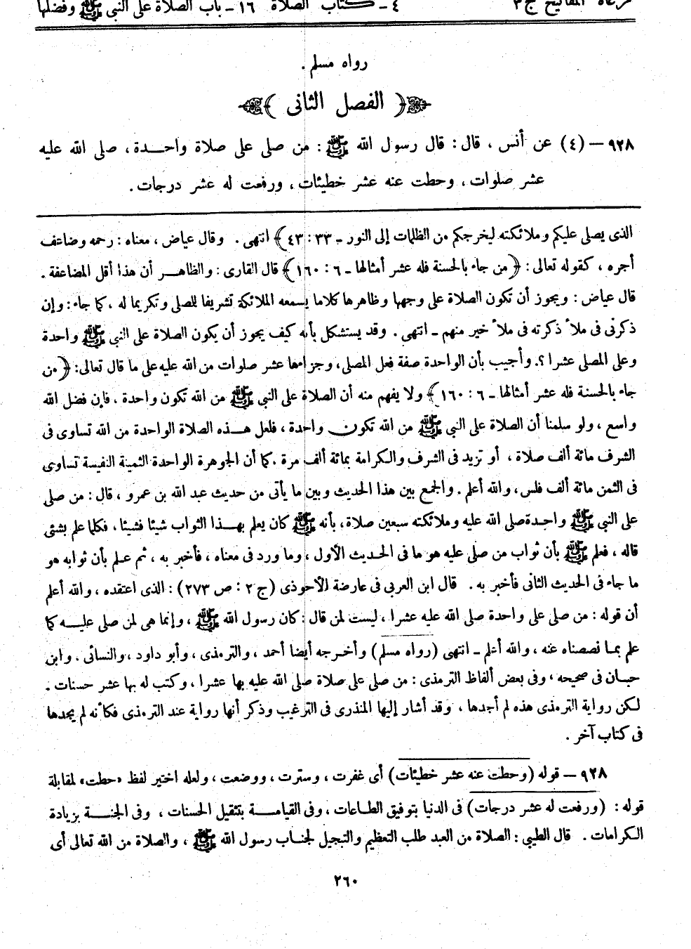928- (4) عن أنس، قال: قال رسول الله - صلى الله عليه وسلم -: ((من صلى علي صلاة واحدة، صلى الله عليه عشر صلوات، وحطت عنه عشر خطيئات، ورفعت له عشر درجات.