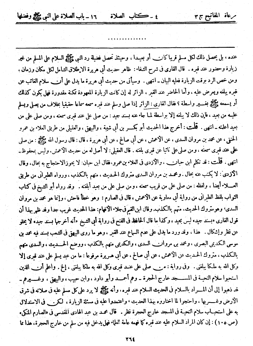 عنده، بل يحصل ذلك لكل مسلم قريباً كان أو بعيداً، وحينئذٍ تحصل فضيلة رد النبي - صلى الله عليه وسلم - السلام على المسلّم من غير زيارة وحضور عند قبره. قال القاري في شرح الشفاء: ظاهر حديث أبي هريرة الإطلاق الشامل لكل مكان وزمان، ومن خص الرد بوقت الزيارة فعليه البيان-انتهى. وسيأتي من حديث أبي هريرة ما يدل على أن سلام الغائب عن قبره يبلغه ويعرض عليه، وأما الحاضر عند القبر، الزائر له إن كانت الزيارة المعهودة ممكنة مقدورة فهل يكون كذلك أو يسمعه - صلى الله عليه وسلم - بغير واسطة؟ فقال القاري: الزائر إذا صلى وسلم عند قبره سمعه سماعاً حقيقياً بخلاف من يصلي ويسلم عليه من بعيد، فإن ذلك لا يبلغه إلا بواسطة لما جاء عنه بسند جيد: من صلى علي عند قبري سمعته، ومن صلى علي من بعيداً علمته-انتهى. قلت: أخرج هذا الحديث أبوبكر بن أبي شيبة، والبيهقي، والعقيلي من طريق العلاء بن عمرو الحنفي، عن محمد بن مروان السدي، عن الأعمش، عن أبي صالح، عن أبي هريرة، قال: قال رسول الله - صلى الله عليه وسلم -: من صلى عليّ عند قبري سمعته، ومن صلى علي نائياً عن قبري بلغته. قال العقيلي: لا أصل له من حديث الأعمش، وليس بمحفوظ-انتهى. قلت: قد تكلم ابن حبان، والأزدي في العلاء بن عمرو، فقال ابن حبان: لا يجوز الاحتجاج به بحال، وقال الأزدي: لا يكتب عنه بحال. ومحمد بن مروان السدي متروك الحديث، متهم بالكذب، ورواه الطبراني من طريق العلاء أيضاً، ولفظه: من صلى علي من قريب سمعته، ومن صلى علي من بعيد أبلغته. وقد رواه أبوالشيخ في كتاب الثواب بلفظ الطبراني من رواية أبي معاوية عن الأعمش، قال في الصارم: وهو خطأ فاحش، وإنما هو محمد بن مروان السدي، وهو متروك الحديث، متهم بالكذب. وقال ابن القيم في جلاء الأفهام: هذا الحديث غريب جداً، وقد ظهر بهذا أن قول القاري "بسند جيد" ليس بجيد، وكذا ما قال الحافظ في الفتح في رواية أبي الشيخ "أنه أخرجها بسند جيد" لا يخلو عن نظر وإشكال. وهذا، وقد ورد ما يدل على عدم السماع عند القبر، وهو ما روى البيهقي في الشعب بسند فيه محمد بن موسى الكديمي البصري، ومحمد بن مروان السدي، والكديمي متهم بالكذب، ووضع الحديث، والسدي متهم بالكذب، متروك الحديث عن الأعمش، عن أبي صالح، عن أبي هريرة مرفوعاً: ما من عبد يسلم علي عند قبري إلا وكّل الله به ملكاً يبلغني. وفي رواية: من صلى علي عند قبري وكل الله به ملكا يبلغني، الخ. واعلم أن الذي استحبوا سلام التحية في المسجد خارج الحجرة - وهم أحمد وأبوداود، وابن حبيب والبيهقي، وغيرهم - قد ذهبوا إلى أن المراد بالسلام في الحديث السلام عند قبره، وأنه - صلى الله عليه وسلم - لا يرد على كل مسلّم عليه في صلاته في شرق الأرض وغربها، واحتجوا لما اختاروه بهذا الحديث، واعتمدوا عليه في مسألة الزيارة، لكن في الاستدلال به على استحباب سلام التحية في المسجد خارج الحجرة نظر. قال محمد بن عبد الهادي المقدسي في "الصارم المنكي" (ص105) : إن كان المراد السلام عليه عند قبره كما فهمه عامة العلماء فهل يدخل فيه من سلّم من خارج الحجرة، هذا مما