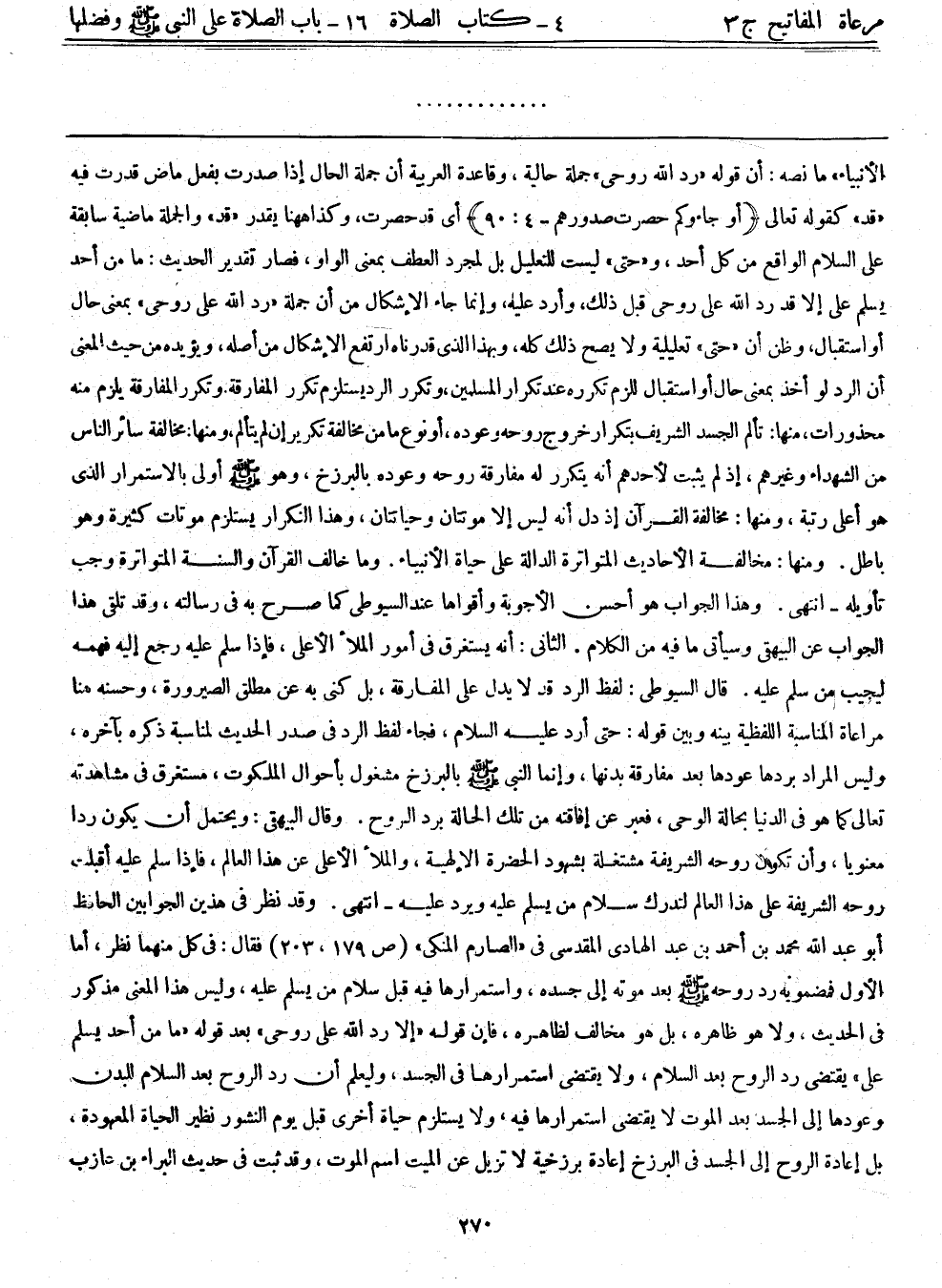 الأنبياء" ما نصه: أن قوله " رد الله روحي" جملة حالية، وقاعدة العربية أن جملة الحال إذا صدرت بفعل ماض قدرت فيه "قد" كقوله تعالى: {أو جاءوكم حصرت صدورهم} [4: 90] أي قد حصرت، وكذا ههنا يقدر "قد" والجملة ماضية سابقة على السلام الواقع من كل أحد، و"حتى" ليست للتعليل بل لمجرد العطف بمعنى الواو، فصار تقدير الحديث: ما من أحد يسلم علي إلا قد رد الله علي روحي قبل ذل: وأرد عليه، وإنما جاء الإشكال من أن جملة "رد الله علي روحي" بمعنى حال أو استقبال، وظن أن "حتى" تعليلية ولا يصح ذلك كله، وبهذا الذي قدرناه ارتفع الإشكال من أصله، ويؤيده من حيث المعنى أن الرد لو أخذ بمعنى حال أو استقبال للزم تكرره عند تكرار المسلمين، وتكرر الرد يستلزم تكرر المفارقة، وتكرر المفارقة يلزم منه محذورات، منها: تألم الجسد الشريف بتكرار خروج روحه وعوده، أو نوع ما من مخالفة تكرير إن لم يتألم، ومنها: مخالف سائر الناس من الشهداء وغيرهم، إذ لم يثبت لأحدهم أنه يتكرر له مفارقة روحه وعوده بالبرزخ، وهو - صلى الله عليه وسلم - أولى بالاستمرار الذي هو أعلى رتبة، ومنها: مخالفة القرآن إذ دل أنه ليس إلا موتتان وحياتتان، وهذا التكرار يستلزم موتات كثيرة وهو باطل. ومنها: مخالفة الأحاديث المتواترة الدالة على حياة الأنبياء. وما خالف القرآن والسنة المتواترة وجب تأويله-انتهى. وهذا الجواب هو أحسن الأجوبة وأقواها عند السيوطي كما صرح به في رسالته، وقد تلقى هذا الجواب عن البيهقي وسيأتي ما فيه من الكلام. الثاني: أنه يستغرق في أمور الملأ الأعلى، فإذا سلم عليه رجع إليه فهمه ليجيب من سلم عليه، قال السيوطي: لفظ الرد قد لا يدل على المفارقة، بل كنى به عن مطلق الصيرورة، وحسنه هنا مراعاة المناسبة اللفظية بينه وبين قوله: حتى أرد عليه السلام، فجاء لفظ الرد في صدر الحديث لمناسبة ذكره بآخره، وليس المراد بردها عودها بعد مفارقة بدنها، وإنما النبي - صلى الله عليه وسلم - بالبرزخ مشغول بأحوال الملكوت، مستغرق في مشاهدته تعالى كما هو في الدنيا بحالة الوحي، فعبر عن أفاقته من تلك الحالة برد الروح. وقال البيهقي: ويحتمل أن يكون رداً معنوياً، وأن تكون روحه الشريفة مشتغلة بشهود الحضرة الإلهية، والملأ الأعلى عن هذا العالم، فإذا سلم عليه أقبلت روحه الشريفة على هذا العالم لتدرك سلام من يسلم عليه ويرد عليه-انتهى. وقد نظر في هذين الجوابين الحافظ أبوعبد الله بن محمد بن أحمد بن عبد الهادي المقدسي في "الصارم المنكي (ص 179، 203) فقال: في كل منهما نظر، أما الأول فمضمونه رد روحه - صلى الله عليه وسلم - بعد موته إلى جسده، واستمرارها فيه قبل سلام من يسلم عليه، وليس هذا المعنى مذكور في الحديث، ولا هو ظاهره، بل هو مخالف لظاهره، فإن قوله "إلا رد الله علي روحي" بعد قوله "ما من أحد يسلم على "يقتضي رد الروح بعد السلام، ولا يقتضي استمرارها في الجسد، وليعلم أن رد الروح بعد السلام للبدن وعودها إلى الجسد بعد الموت لا يقتضي استمرارها فيه، ولا يستلزم حياة أخرى قبل يوم النشور نظير الحياة المعهودة، بل إعادة الروح إلى الجسد في البرزخ إعادة برزخية لا تزيل عن الميت اسم الموت، وقد ثبت في حديث البراء بن عازب