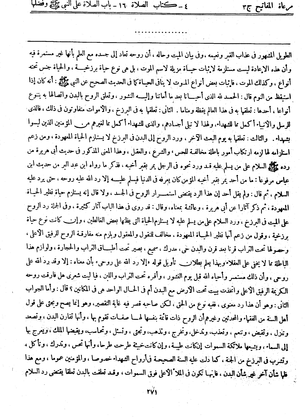الطويل المشهور في عذاب القبر ونعيمه، وفي بيان الميت وحاله، أن روحه تعاد إلى جسده مع العلم بأنها غير مستمرة فيه وأن هذه الإعادة ليست مستلزمة لإثبات حياة مزيلة لاسم الموت، بل هي نوع حياة برزخية، والحياة جنس تحته أنواع، وكذلك الموت، فإثبات بعض أنواع الموت لا ينافي الحياة كما في الحديث الصحيح عن النبي - صلى الله عليه وسلم -: أنه كان إذا استيقظ من النوم قال: الحمد لله الذي أحياناً بعد ما أماتنا وإليه النشور، وتعلق الروح بالبدن واتصالها به يتنوع أنواعاً، أحدها: تعلقها به في هذا العالم يقظة ومناماً. الثاني: تعلقها به في البرزخ، والأموات متفاوتون في ذلك، فالذي للرسل والأنبياء أكمل مما للشهداء، ولهذا لا تبلى أجسادهم، والذي للشهداء أكمل مما لغيرهم من المؤمنين الذين ليسوا بشهداء. والثالث: تعلقها به يوم البعث الآخر، ورد الروح إلى البدن في البرزخ لا يستلزم الحياة المعهودة، ومن زعم استلزمه لها لزمه ارتكاب أمور باطلة مخالفة للحس، والشرع، والعقل، وهذا المعنى المذكور في حديث أبي هريرة من رده - صلى الله عليه وسلم - السلام على من يسلم عليه قد ورد نحوه في الرجل يمر بقبر أخيه، فذكر ما رواه ابن عبد البر من حديث ابن عباس مرفوعاً: ما من أحد يمر بقبر أخيه المؤمن كان يعرفه في الدنيا فيسلم عليه إلا رد الله عليه روحه. حتى يرد عليه السلام، ثم قال: ولم يقل أحد إن هذا الرد يقتضي استمرار الروح في الجسد، ولا قال إنه يستلزم حياة نظير الحياة المعهودة، ثم ذكر آثاراً عن أبي هريرة، وعائشة بمعناه، وقال: قد روي في هذا الباب آثار كثيرة، وفي الجملة رد الروح على الميت في البرزخ، ورد السلام على من يسلم عليه لا يستلزم الحياة التي يظنها بعض الغالطين، وإن كانت نوع حياة برزخية، وقول من زعم أنها نظير الحياة المعهودة، مخالف للمنقول والمعقول، ويلزم منه مفارقته الروح للرفيق الأعلى، وحصولها تحت التراب قرناً بعد قرن والبدن حي مدرك سميع بصير تحت أطباق التراب والحجارة، ولوازم هذا الباطلة مما لا يخفى على العقلاء وبهذا يعلم بطلان تأويل قوله "إلا رد الله على روحي" بأن معناه: إلا وقد رد الله علي روحي، وأن ذلك مستمر وأحياه الله قبل يوم النشور، وأقره تحت التراب واللبن، فيا ليت شعري هل فارقت روحه الكريمة الرفيق الأعلى واتخذت بييت تحت الأرض مع البدن أم في الحال الواحد هي في المكانين؟ قال: وأما الجواب الثاني: وهو أن هذا رد معنوي، ففيه نوع من الحق، لكن صاحبه قصر فيه غاية التقصير، وهو إنما يصح ويجيء على قول أهل السنة من الفقهاء والمحدثين وغيرهم أن الروح ذات قائمة بنفسها لها صفات تقوم بها، وأنها تقارن البدن، وتصعد وتنزل، وتقبض، وتنعم، وتعذب، وتدخل، وتخرج، وتذهب، وتجيء، وتسأل، وتحاسب، ويقبضها الملك، ويعرج بها إلى السماء، ويشيعها ملائكة السموات إن كانت طيبة، وإن كانت خبيثة طرحت طرحاً، وأنه تحس، وتدرك، وتأكل، وتشرب في البرزخ من الجنة، كما دلت عليه السنة الصحيحة في أرواح الشهداء خصوصاً، والمؤمنين عموماً، ومع هذا فلها شأن آخر غير شأن البدن، فإنها تكون في الملأ الأعلى فوق السموات، وقد تعلقت بالبدن تعلقاً يقتضي رد السلام