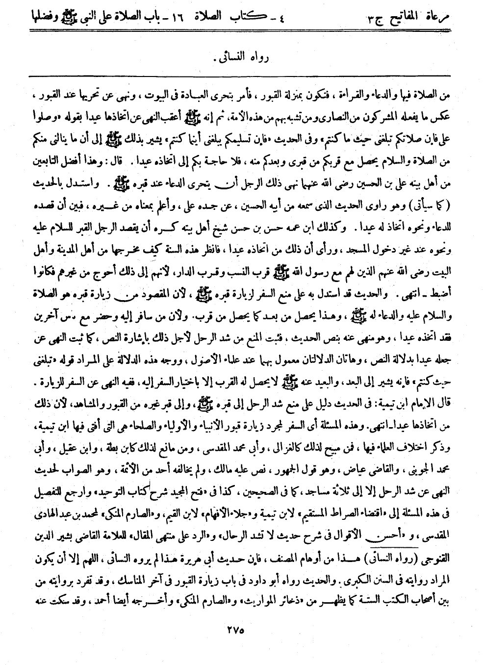 من الصلاة فيها والدعاء والقراءة، فتكون بمنزلة القبور، فأمر بتحرى العبادة في البيوت، ونهى عن تحريها عند القبور، عكس ما يفعله المشركون من النصارى ومن تشبه بهم من هذه الأمة، ثم إنه - صلى الله عليه وسلم - أعقب النهي عن اتخاذها عيداً بقوله: "وصلوا عليّ فإن صلاتكم تبلغني حيث ما كنتم"، وفي الحديث: "فإن تسليمكم يبلغني أينما كنتم"، يشير بذلك - صلى الله عليه وسلم - إلى أن ما ينالني منكم من الصلاة والسلام يحصل مع قربكم من قبري وبعدكم منه، فلا حاجة بكم إلى اتخاذه عيداً. قال: وهذا أفضل التابعين من أهل بيته علي بن الحسين رضي الله عنهما نهى ذلك الرجل أن يتحرى الدعاء عند قبره - صلى الله عليه وسلم -. واستدل بالحديث (كما سيأتي) وهو راوي الحديث الذي سمعه من أبيه الحسين، عن جده علي، وأعلم بمعناه من غيره، فبين أن قصده للدعاء ونحوه اتخاذ له عيداً. وكذلك ابن عمه حسن بن حسن شيخ أهل بيته كره أن يقصد الرجل القبر للسلام عليه ونحوه عند غير دخول المسجد. ورأى أن ذلك من اتخاذه عيداً، فانظر هذه السنة كيف مخرجها من أهل المدينة وأهل البيت - رضي الله عنهم - الذين لهم مع رسول الله - صلى الله عليه وسلم - قرب النسب الدار، لأنهم إلى ذلك أحوج من غيرهم فكانوا أضبط-انتهى. والحديث قد استدل به على منع السفر لزيارة قبره - صلى الله عليه وسلم -، لأن المقصود من زيارة قبره هو الصلاة والسلام عليه والدعاء له - صلى الله عليه وسلم -، وهذا يحصل من بُعد كما يحصل من قرب. ولأن من سافر إليه وحضر مع ناس آخرين فقد اتخذه عيداً، وهو منهي عنه بنص الحديث، فثبت المنع من شد الرحل لأجل ذلك بإشارة النص، كما ثبت النهي عن جعله عيداً بدلالة النص، وهاتان الدلالتان معمول بهما عند علماء الأصول، ووجه هذه الدلالة على المراد قوله "تبلغني حيث كنتم"، فإنه يشير إلى البُعد، والبعيد عنه - صلى الله عليه وسلم - لا يحصل له القرب إلا باختيار السفر إليه، ففيه النهي عن السفر للزيارة. قال الإمام ابن تيمية: في الحديث دليل على منع شد الرحل إلى قبره - صلى الله عليه وسلم -، وإلى قبر غيره من القبور والمشاهد، لأن ذلك من اتخاذها عيداً -انتهى. وهذه المسألة أي السفر لمجرد زيارة قبور الأنبياء والأولياء والصلحاء هي التي أفتى فيها ابن تيمية، وذكر اختلاف العلماء فيها، فمن مبيح لذلك كالغزالي، وأبي محمد المقدسي، ومن مانع لذلك كابن بطة، وابن عقيل، وأبي محمد الجويني، والقاضي عياض، وهو قول الجمهور، نص عليه مالك، ولم يخالفه أحد من الأئمة، وهو الصواب لحديث النهي عن شد الرحل إلا إلى ثلاثة مساجد، كما في الصحيحين، كذا في "فتح المجيد شرح كتاب التوحيد". وارجع للتفصيل في هذه المسألة إلى "اقتضاء الصراط المستقيم" لابن تيمية، و"جلاء الأفهام" لابن القيم، و"الصارم المنكي" لمحمد بن عبد الهادي المقدسي، و"أحسن الأقوال في شرح حديث لا تشد الرحال"، و"الرد على منتهى المقال" للعلامة القاضي بشير الدين القنوجي. (رواه النسائي) هذا من أوهام المصنف، فإن حديث أبي هريرة هذا لم يروه النسائي، اللهم إلا أن يكون المراد روايته في السنن الكبرى. والحديث رواه أبوداود في باب زيارة القبور في آخر المناسك، وقد تفرد بروايته من بين أصحاب الكتب الستة كما يظهر من "ذخائر المواريث" و"الصارم المنكي". وأخرجه أيضا أحمد، وقد سكت عنه