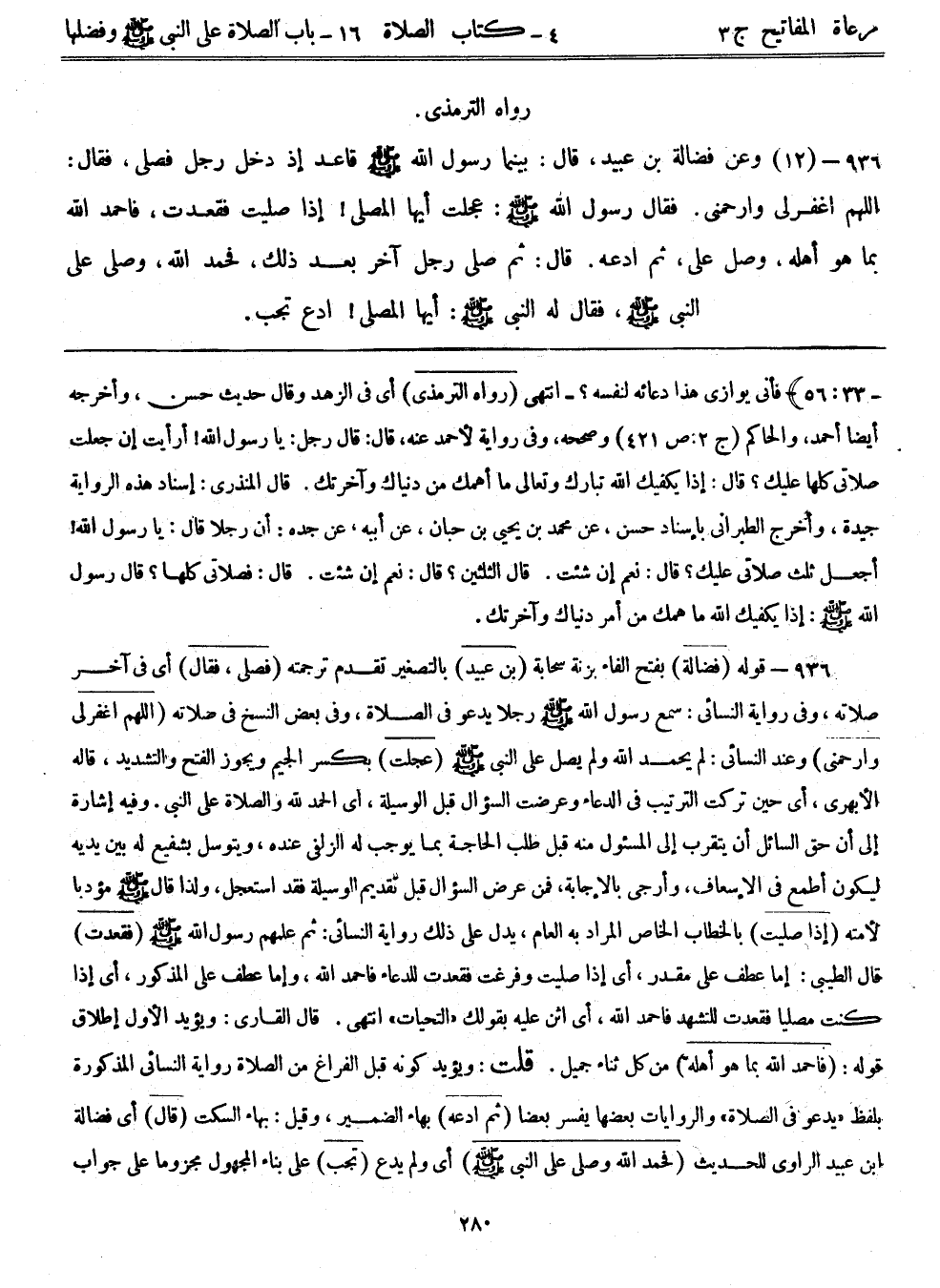 936- (12) وعن فضالة بن عبيد، قال: ((بينما رسول الله - صلى الله عليه وسلم - قاعد إذ دخل رجل فصلى، فقال: اللهم اغفرلي وارحمني. فقال رسول الله - صلى الله عليه وسلم -: عجلت أيها المصلي! إذا صليت فقعدت، فاحمد الله بما هو أهله، وصل علي، ثم ادعه. قال: ثم صلى رجل آخر بعد ذلك، فحمد الله، وصلى على النبي - صلى الله عليه وسلم -، فقال له النبي - صلى الله عليه وسلم -: أيها المصلي! ادع تجب.