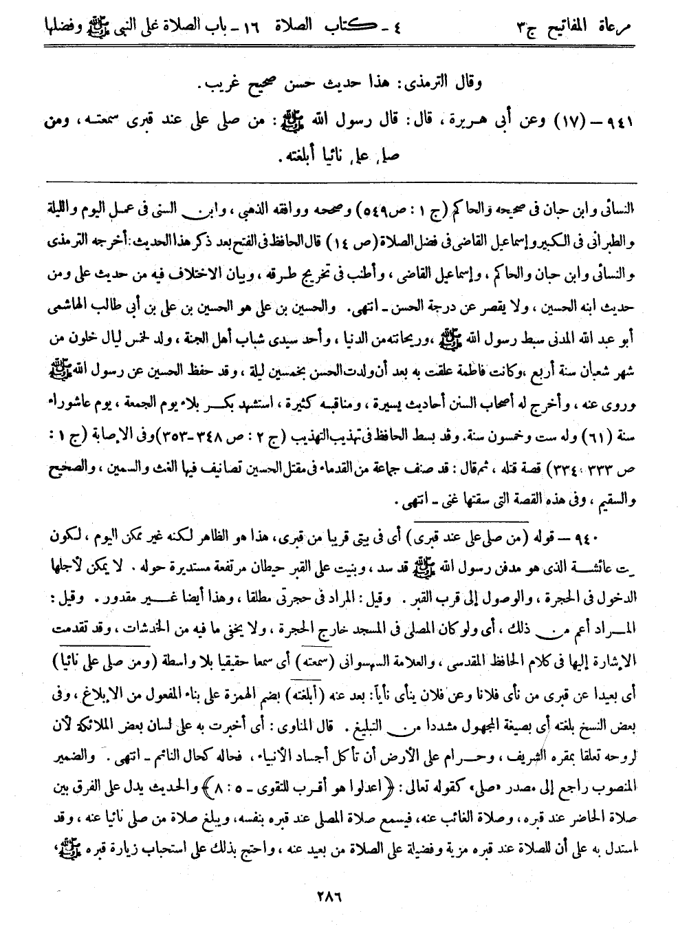941- (17) وعن أبي هريرة، قال: قال رسول الله - صلى الله عليه وسلم -: ((من صلى علي عند قبري سمعته، ومن صلى علي نائياً أبلغته))