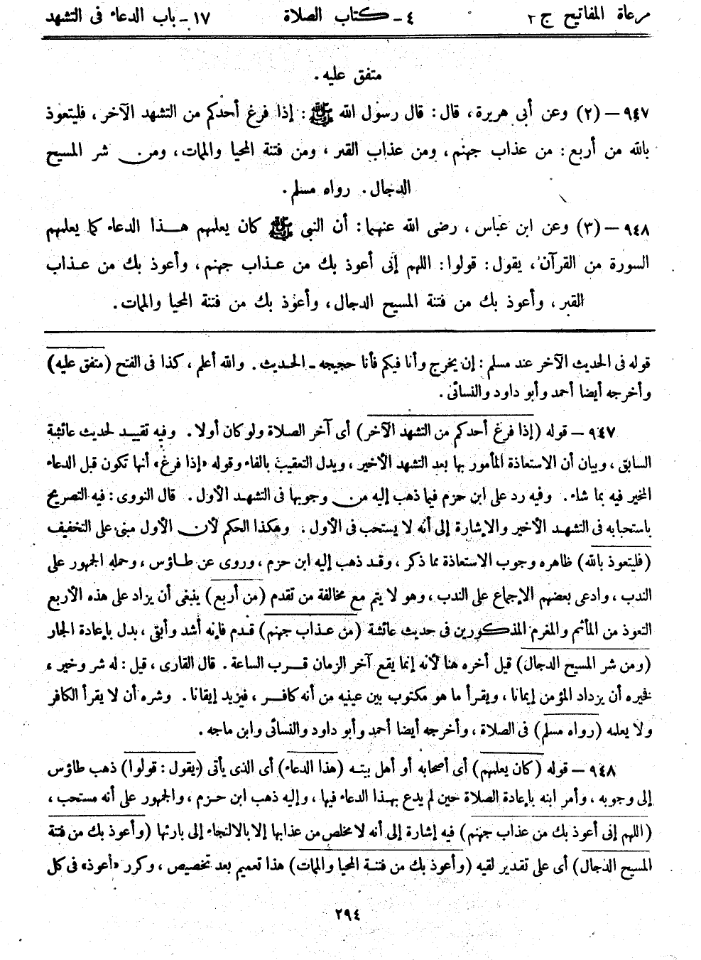 947- (2) وعن أبي هريرة، قال: قال رسول الله - صلى الله عليه وسلم -: ((إذا فرغ أحدكم من التشهد الآخر، فليتعوذ بالله من أربع: من عذاب جهنم، ومن عذاب القبر، ومن فتنة المحيا والممات، ومن شر المسيح الدجال)) رواه مسلم.