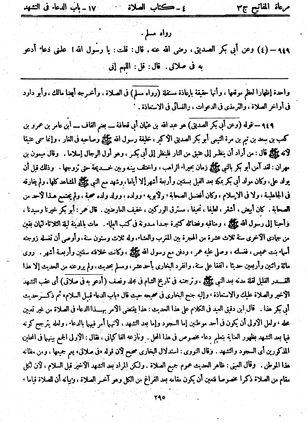 949- (4) وعن أبي بكر الصديق، رضي الله عنه، قال ((قلت: يارسول الله! علمني دعاء أدعو به