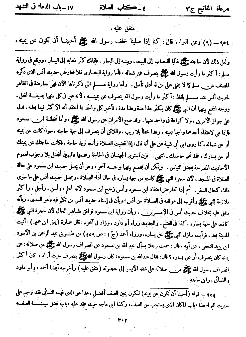 ولعل ذلك؛ لأن حاجته - صلى الله عليه وسلم - غالباً الذهاب إلى البيت، وبيته إلى اليسار، فلذلك كثر ذهابه إلى اليسار، ووقع في رواية مسلم: أكثر ما رأيت رسول الله - صلى الله عليه وسلم - ينصرف عن شماله، فأما رواية البخاري فلا تعارض حديث أنس الذي ذكره المصنف عن مسلم كما لا يخفى على من له أدنى تأمل. وأما رواية مسلم التي ذكرناها الآن فهي معارضة في الظاهر لحديث أنس عند مسلم بلفظ: أكثر ما رأيت رسول الله ينصرف عن يمينه؛ لأنه عبر في كل منهما بصيغة أفعل. ووجه الجمع بينهما أن النبي - صلى الله عليه وسلم - كان يكثر هذا مدة وهذا مدة، فأخبر كل واحد بما اعتقد أنه الأكثر فيما يعلمه، فدل على جواز الأمرين، ولا كراهة في واحد منهما. وقد صح الأمران عن رسول الله - صلى الله عليه وسلم -، وأما تخطئة ابن مسعود فإنما هي لاعتقاد أحدهما واجباً بعينه، وهذا خطأ بلا ريب، واللائق أن ينصرف إلى جهة حاجته، سواء كانت عن يمينه أو عن شماله، كما روى ابن أبي شيبة عن علي أنه قال: إذا قضيت الصلاة وأنت تريد حاجة، فكانت حاجتك عن يمينك أو عن يسارك، فخذ نحو حاجتك- انتهى. فإن استوى الجهتان في الحاجة وعدمها فاليمين أفضل بلا وجوب لعموم الأحاديث المصرحة بفضل التيامن. ويمكن أن يجمع بينهما بوجه آخر، وهو أن يحمل حديث ابن مسعود على حالة الصلاة في المسجد؛ لأن حجرة النبي - صلى الله عليه وسلم - كانت من جهة يساره في حال أداء الصلاة، ويحمل حديث أنس على ما سوى ذلك كحال السفر، ثم إذا تعارض اعتقاد ابن مسعود وأنس رجح ابن مسعود لأنه أعلم، وأسن، وأجل، وأكثر ملازمة للنبي - صلى الله عليه وسلم - وأقرب إلى موقفه في الصلاة من أنس، وبأن في إسناد حديث أنس من تكلم فيه وهو السدي، وبأنه متفق عليه بخلاف حديث أنس الأمرين، وبأن رواية ابن مسعود توافق ظاهر الحال؛ لأن حجرة النبي - صلى الله عليه وسلم - كانت على جهة يساره، كذا في الفتح. والحديث رواه أبوداود، وزاد في آخره: قال عمارة. (يعني ابن عمير) : أتيت المدينة بعد، فرأيت منازل النبي - صلى الله عليه وسلم - عن يساره، ورواه أحمد (ج1:ص459) من طريق عبد الرحمن بن الأسود ابن يزيد النخعي، عن أبيه، قال: سمعت رجلاً يسأل عبد الله بن مسعود عن انصراف رسول الله - صلى الله عليه وسلم - من صلاته: عن يمينه كان ينصرف أو عن يساره؟ قال: فقال عبد الله بن مسعود: كان رسول الله - صلى الله عليه وسلم - ينصرف حيث أراد، كان أكثر انصراف رسول الله - صلى الله عليه وسلم - من صلاته على شقه الأيسر إلى حجرته. (متفق عليه) وأخرجه أيضاً أحمد، وأبوداود، والنسائي، وابن ماجه.
