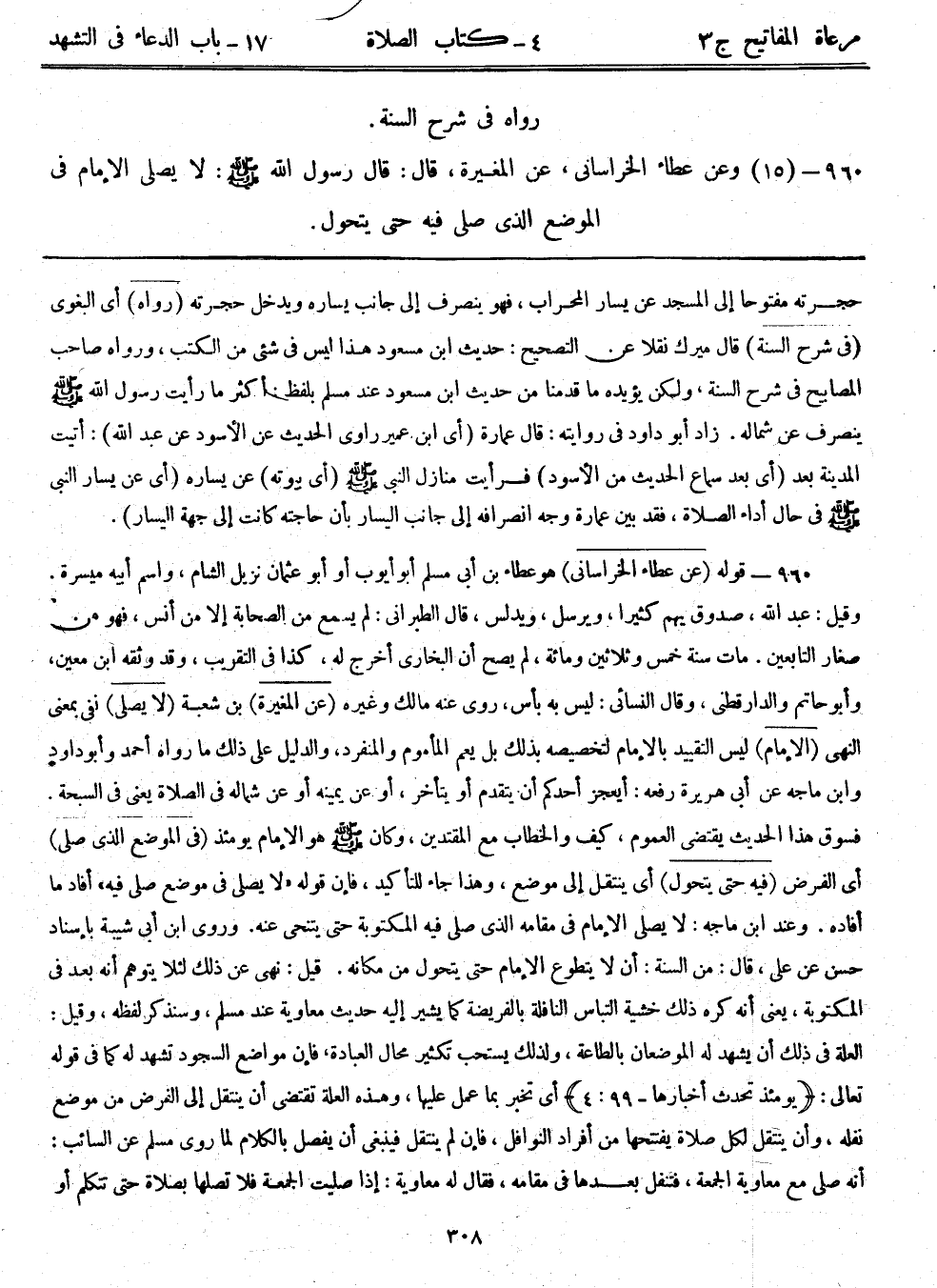 960- قوله: (عن عطاء الخراساني) هو عطاء بن أبي مسلم أبوأيوب أو أبوعثمان نزيل الشام، واسم أبيه ميسرة. وقيل: عبد الله، صدوق يهم كثيراً، ويرسل، ويدلس، قال الطبراني: لم يسمع من الصحابة إلا من أنس، فهو من صغار التابعين. مات سنة خمس وثلاثين ومائة، لم يصح أن البخاري أخرج له، كذا في التقريب، وقد وثقه ابن معين، وأبوحاتم والدارقطني، وقال النسائي: ليس به بأس، روى عنه مالك وغيره. (عن المغيرة) بن شعبة. (لا يصلي) نفي بمعنى النهي. (الإمام) ليس التقييد بالإمام لتخصيصه بذلك بل يعم المأموم والمنفرد، والدليل على ذلك ما رواه أحمد وأبوداود وابن ماجه عن أبي هريرة رفعه: أيعجز أحدكم أن يتقدم أو يتأخر، أو عن يمينه أو عن شماله في الصلاة يعني في السبحة. فسوق هذا الحديث يقتضي العموم، كيف والخطاب مع المقتدين، وكان - صلى الله عليه وسلم - هو الإمام يومئذٍ. (في الموضع الذي صلى) أي الفرض. (فيه حتى يتحول) أي ينتقل إلى موضع، وهذا جاء للتأكيد، فإن قوله: "لا يصلي في موضع صلى فيه" أفاد ما أفاده. وعند ابن ماجه: لا يصلي الإمام في مقامه الذي صلى فيه المكتوبة حتى يتنحى عنه. وروى ابن أبي شيبة بإسناد حسن عن علي، قال: من السنة: أن لا يتطوع الإمام حتى يتحول من مكانه. قيل: نهى عن ذلك لئلا يتوهم أنه بعد في المكتوبة، يعني أنه كره ذلك خشية التباس النافلة بالفريضة كما يشير إليه حديث معاوية عند مسلم، وسنذكر لفظه، وقيل: العلة في ذلك أن يشهد له الموضعان بالطاعة، ولذلك يستحب تكثير محال العبادة، فإن مواضع السجود تشهد له كما في قوله تعالى: {يومئذ تحدث أخبارها} [99: 4] أي تخبر بما عمل عليها، وهذه العلة تقتضى أن ينتقل إلى الفرض من موضع نفله، وأن ينتقل لكل صلاة يفتحها من أفراد النوافل، فإن لم ينتقل فينبغي أن يفصل بالكلام لما روى مسلم عن السائب: أنه صلى مع معاوية الجمعة، فتنفل بعدها في مقامه، فقال له معاوية: إذا صليت الجمعة فلا تصلها بصلاة حتى تتكلم أو