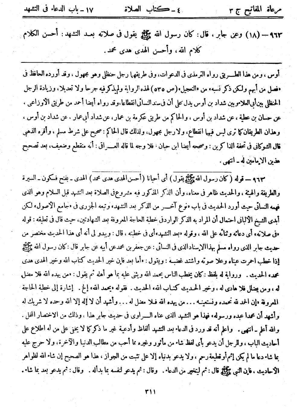 963- (18) وعن جابر، قال. ((كان رسول الله يقول في صلاته بعد التشهد: أحسن الكلام كلام