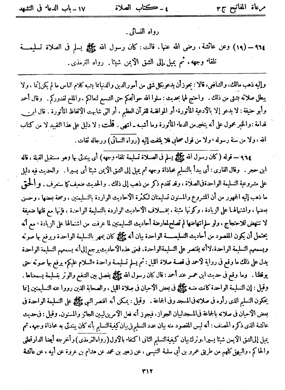 964- (19) وعن عائشة، رضي الله عنها، قالت: ((كان رسول الله - صلى الله عليه وسلم - يسلم في الصلاة تسليمة