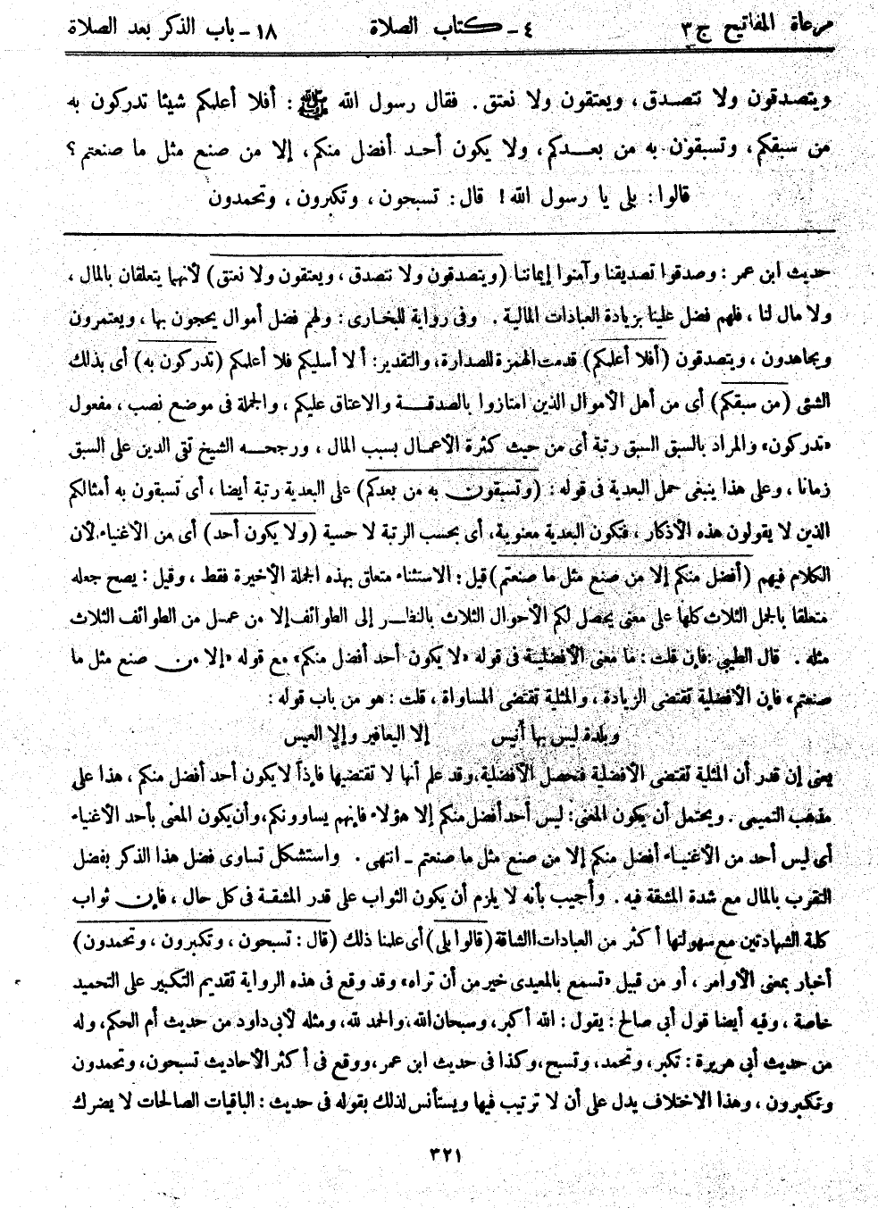 حديث ابن عمر: وصدقوا تصديقنا وآمنوا إيماننا. (ويتصدقون ولا نتصدق، ويعتقون ولا نعتق) ؛ لأنهما يتعلقان بالمال ولا مال لنا، فلهم علينا بزيادة العبادات المالية. وفي رواية للبخاري: ولهم فضل أموال يحجون بها، ويعتمرون ويجاهدون، ويتصدقون. (أفلا أعلمكم) قدمت الهمزة للصدارة، والتقدير: ألا أسليكم فلا أعلمكم. (تدركون به) أي بذلك الشيء. (من سبقكم) أي من أهل الأموال الذين امتازوا بالصدقة والاعتاق عليكم، والجملة في موضع نصب، مفعول "تدركون". والمراد بالسبق السبق رتبة أي من حيث كثرة الأعمال بسبب المال، ورجحه الشيخ تقي الدين على السبق زماناً، وعلى هذا ينبغي حمل البعدية في قوله: (وتسبقون به من بعدكم) على البعدية رتبة أيضاً، أي تسبقون به أمثالكم الذين لا يقولون هذه الأذكار، فتكون البعدية معنوية، أي بحسب الرتبة لا حسية. (ولا يكون أحد) أي من الأغنياء؛ لأن الكلام فيهم. (أفضل منكم إلا من صنع مثل ما صنعتم) قيل: الاستثناء متعلق بهذه الجملة الأخيرة فقط، وقيل: يصح جعله متعلقاً بالجمل الثلاث كلها، على معنى يحصل لكم الأحوال الثلاث بالنظر إلى الطوائف إلا من عمل من الطوائف الثلاث مثله. قال الطيبي: فإن قلت: ما معنى الأفضلية في قوله "لا يكون أحد أفضل منكم" مع قوله "إلا من صنع مثل ما صنعتم"، فإن الأفضلية تقتضى الزيادة، والمثلية تقتضي المساواة، قلت: هو من باب قوله: