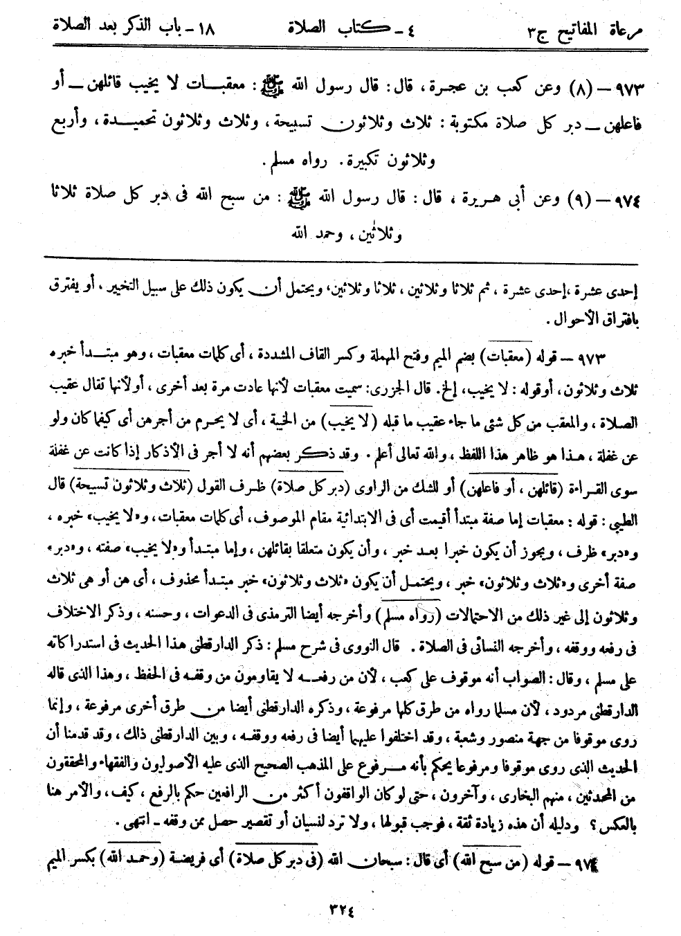 973- (8) وعن كعب بن عجرة، قال: قال رسول الله - صلى الله عليه وسلم -: ((معقبات لا يخيب قائلهن- أو فاعلهن- دبر كل صلاة مكتوبة: ثلاث وثلاثون تسبيحة، وثلاث وثلاثون تحميدة، وأربع وثلاثون تكبيرة)) .رواه مسلم.
