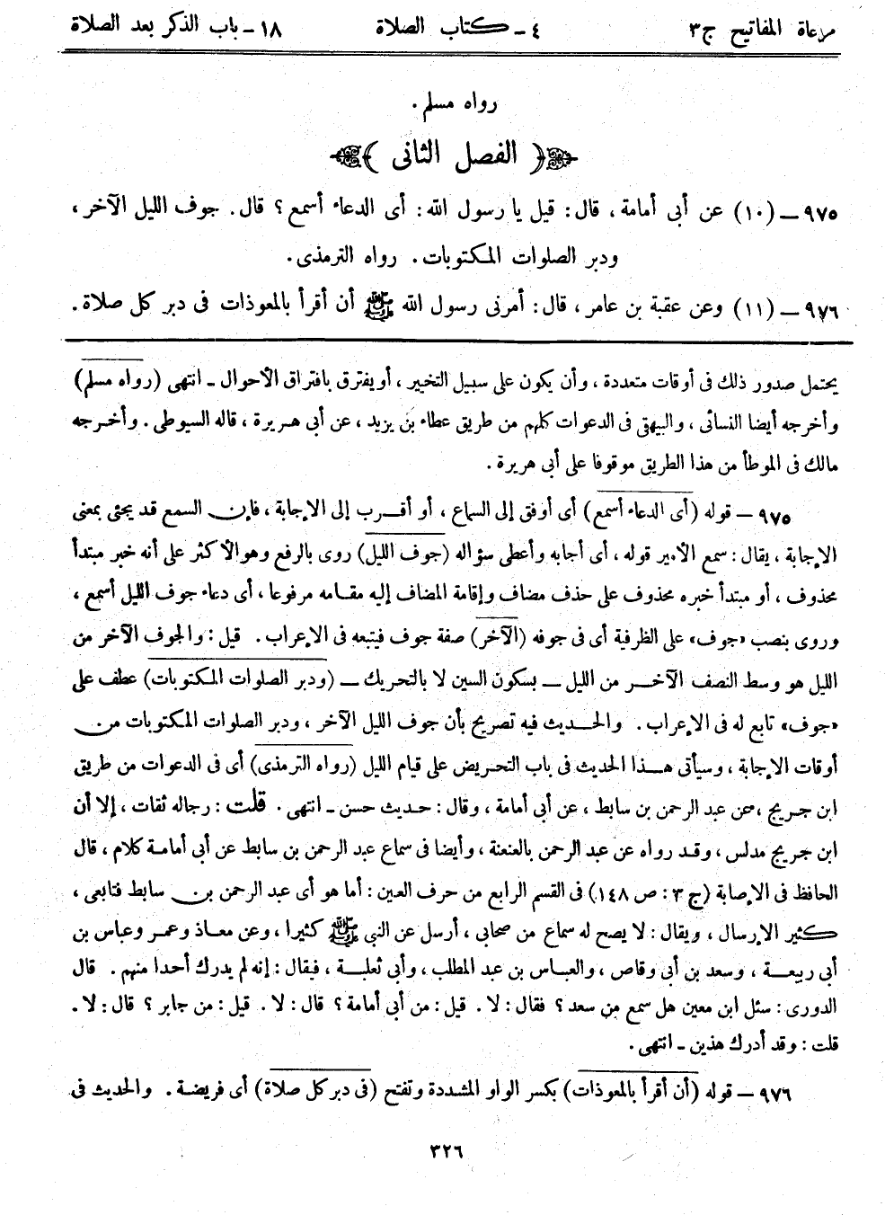 975- (10) عن أبي أمامة، قال: ((قيل يا رسول الله - صلى الله عليه وسلم -: أي الدعاء أسمع؟ قال: جوف الليل الآخر، ودبر الصلوات المكتوبات)) . رواه الترمذي.