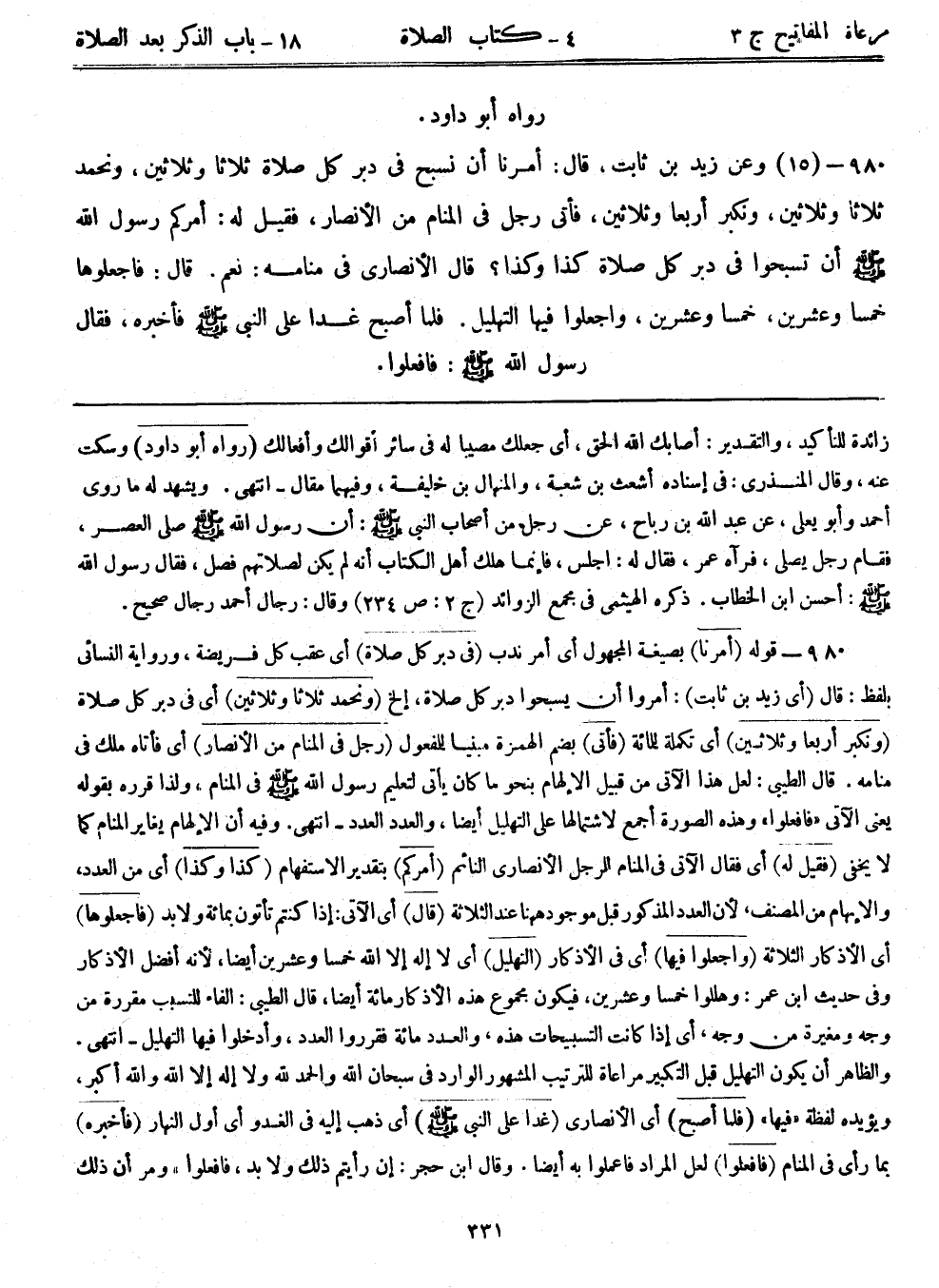 980- (15) وعن زيد بن ثابت، قال: ((أمرنا أن نسبح في دبر كل صلاة ثلاثاً وثلاثين، ونحمد ثلاثاً وثلاثين، ونكبر أربعاً وثلاثين، فأتى رجل في المنام من الأنصار، فقيل له: أمركم رسول الله - صلى الله عليه وسلم - أن تسبحوا في دبر كل صلاة كذا وكذا؟ قال الأنصاري في منامه: نعم. قال: فاجعلوها خمساً وعشرين، خمساً وعشرين، واجعلوا فيها التهليل. فلما أصبح غدا على النبي - صلى الله عليه وسلم - فأخبره، فقال رسول الله - صلى الله عليه وسلم -: فافعلوا)) .