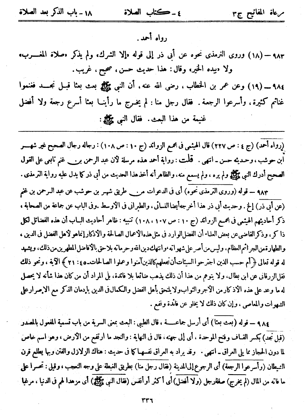 984- (19) وعن عمر بن الخطاب، رضي الله عنه،. ((أن النبي - صلى الله عليه وسلم - بعث قبل نجد فغنموا غنائم كثيرة، وأسرعوا الرجعة. فقال: فقال رجل منا: لم يخرج ما رأينا بعثاً أسرع رجعة ولا أفضل غنيمة من هذا البعث. فقال النبي - صلى الله عليه وسلم -: