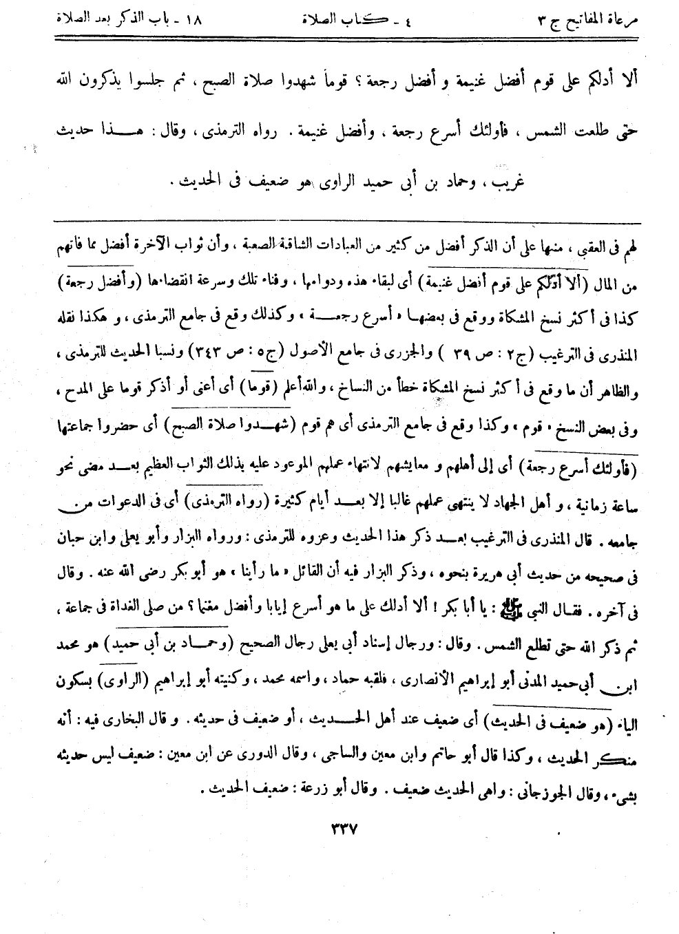 لهم في العقبى، منها على أن الذكر أفضل من كثير من العبادات الشاقة الصعبة، وأن ثواب الآخرة أفضل مما فاتهم من المال. (ألا أدلكم على قوم أفضل غنيمة) أي لبقاء هذه ودوامها، وفناء تلك وسرعة انقضاءها. (وأفضل رجعة) كذا في أكثر نسخ المشكاة ووقع في بعضها "أسرع رجعة" وكذلك وقع في جامع الترمذي، وهكذا نقله المنذري في الترغيب (ج2:ص39) والجزري في جامع الأصول (ج5:ص343) ونسبا الحديث للترمذي، والظاهر أن ما وقع في أكثر نسخ المشكاة خطأ من النساخ، والله أعلم. (قوماً) أي أعنى أو أذكر قوماً على المدح، وفي بعض النسخ "قوم" وكذا وقع في جامع الترمذي أي هم قوم. (شهدوا صلاة الصبح) أي حضروا جماعتها. (فأولئك أسرع رجعة) أي إلى أهلهم ومعايشهم؛ لانتهاء عملهم الموعود عليه بذلك الثواب العظيم بعد مضي نحو ساعة زمانية، وأهل الجهاد لا ينتهي عملهم غالباً إلا بعد أيام كثيرة. (رواه الترمذي) أي في الدعوات من جامعه. قال المنذري في الترغيب بعد ذكر هذا الحديث وعزوه للترمذي: ورواه البزار وأبويعلى وابن حبان في صحيحه من حديث أبي هريرة بنحوه، وذكر البزار فيه أن القائل "ما رأينا" هو أبوبكر رضي الله عنه، وقال في آخره. فقال النبي - صلى الله عليه وسلم -: يا أبا بكر! ألا أدلك على ما هو أسرع إياباً وأفضل مغنماً؟ من صلى الغداة في جماعة، ثم ذكر الله حتى تطلع الشمس. وقال: ورجال إسناد أبي يعلى رجال الصحيح. (وحماد بن أبي حميد) هو محمد ابن أبي حميد المدني أبوإبراهيم الأنصاري، فلقبه حماد، واسمه محمد، وكنيته أبوإبراهيم. (الراوي) بسكون الياء. (هو ضعيف في الحديث) أي ضعيف عند أهل الحديث، أو ضعيف في حديثه. وقال البخاري فيه: أنه منكر الحديث، وكذا قال أبوحاتم وابن معين والساجي، وقال الدوري عن ابن معين: ضعيف ليس حديثه بشيء، وقال الجوزجاني: واهي الحديث ضعيف. وقال أبوزرعة: ضعيف الحديث.