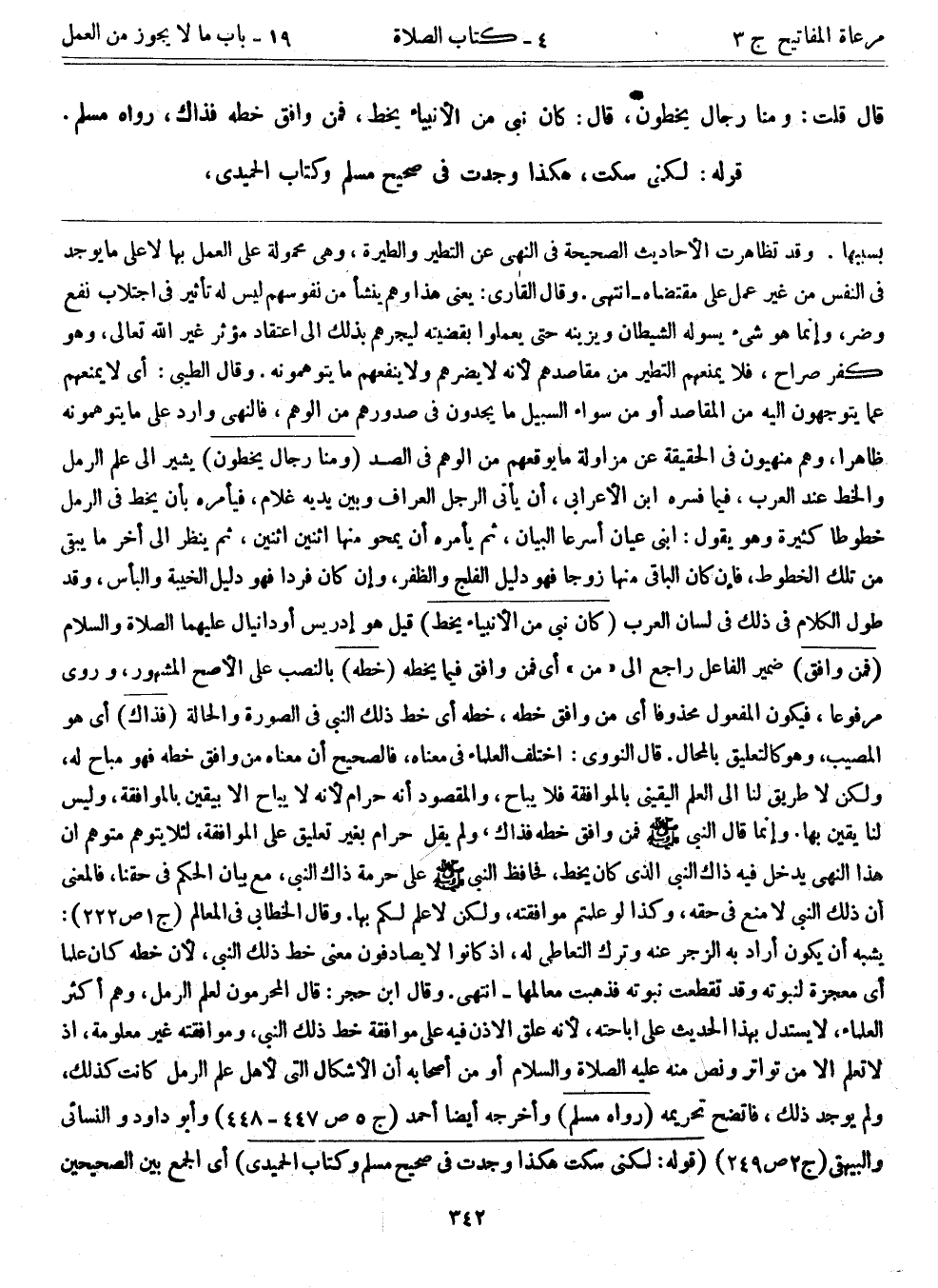 بسببها. وقد تظاهرت الأحاديث الصحيحة في النهي عن التطير والطيرة، وهي محمولة على العمل بها لا على ما يوجد في النفس من غير عمل على مقتضاه- انتهى. وقال القاري: يعني هذا وهم ينشأ من نفوسهم ليس له تأثير في اجتلاب نفع وضر، وإنما هو شيء يسوله الشيطان ويزينه حتى يعملوا بقضيته ليجرهم بذلك إلى اعتقاد مؤثر غير الله تعالى، وهو كفر صراح، فلا يمنعهم التطير من مقاصدهم؛ لأنه لا يضرهم ولا ينفعهم ما يتوهمونه. وقال الطيبي: أي لا يمنعهم عما يتوجهون إليه من المقاصد أو من سواء السبيل ما يجدون في صدورهم من الوهم، فالنهي وارد على ما يتوهمونه ظاهراً، وهم منهيون في الحقيقة عن مزاولة ما يوقعهم من الوهم في الصد. (ومنا رجال يخطون) يشير إلى علم الرمل والخط عند العرب، فيما فسره ابن الأعرابي، أن يأتي الرجل العراف وبين يديه غلام، فيأمره بأن يخط في الرمل خطوطاً كثيرة وهو يقول: ابني عيان أسرعا البيان، ثم يأمره أن يمحو منها اثنين اثنين، ثم ينظر إلى أخر ما يبقى من تلك الخطوط، فإن كان الباقي منها زوجاً فهو دليل الفلج والظفر، وإن كان فردا فهو دليل الخيبة والبأس، وقد طول الكلام في ذلك في لسان العرب. (كان نبي من الأنبياء يخط) قيل: هو إدريس أو دانيال عليهما الصلاة والسلام. (فمن وافق) ضمير الفاعل راجع إلى "من"، أي فمن وافق فيما يخطه. (خطه) بالنصب على الأصح المشهور، وروي مرفوعاً، فيكون المفعول محذوفاً أي من وافق خطه، خطه أي خط ذلك النبي في الصورة والحالة. (فذاك) أي هو المصيب، وهو كالتعليق بالمحال. قال النووي: اختلف العلماء في معناه، فالصحيح أن معناه من وافق خطه فهو مباح له، ولكن لا طريق لنا إلى العلم اليقيني بالموافقة فلا يباح، والمقصود أنه حرام؛ لأنه لا يباح إلا بيقين بالموافقة، وليس لنا يقين بها. وإنما قال النبي - صلى الله عليه وسلم -: فمن وافق خطه فذاك، ولم يقل حرام بغير تعليق على الموافقة، لئلا يتوهم متوهم إن هذا النهي يدخل فيه ذاك النبي الذي كان يخط، فحافظ النبي - صلى الله عليه وسلم - على حرمة ذاك النبي، مع بيان الحكم في حقنا، فالمعنى أن ذلك النبي لا منع في حقه، وكذا لو علمتم موافقته، ولكن لا علم لكم بها. وقال الخطابي في المعالم (ج1ص222) : يشبه أن يكون أراد به الزجر عنه وترك التعاطي له، إذ كانوا لا يصادفون معنى خط ذلك النبي؛ لأن خطه كان علماً، أي معجزة لنبوته وقد تقطعت نبوته فذهبت معالمها-انتهى. وقال ابن حجر: قال المحرمون لعلم الرمل - وهم أكثر العلماء - لا يستدل بهذا الحديث على إباحته؛ لأنه علق الأذن فيه على موافقة خط ذلك النبي، وموافقته غير معلومة، إذ لا تعلم إلا من تواتر ونص منه عليها الصلاة السلام أو من أصحابه أن الأشكال التي لأهل علم الرمل كانت كذلك، ولم يوجد ذلك، فاتضح تحريمه. (رواه مسلم) وأخرجه أيضاً أحمد (ج5 ص447- 448) وأبوداود والنسائي والبيهقي (ج2 ص249) . (قوله: لكني سكت، هكذا وجدت في صحيح مسلم وكتاب الحميدي) أي الجمع بين الصحيحين.