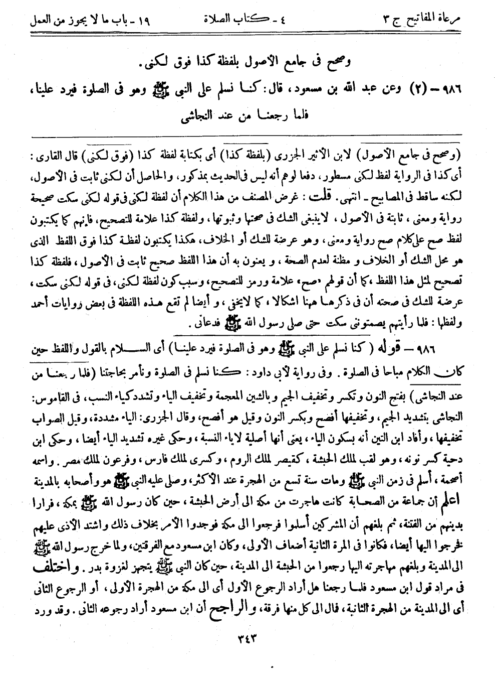 986- قوله: (كنا نسلم على النبي - صلى الله عليه وسلم - وهو في الصلاة فيرد علينا) أي السلام بالقول واللفظ حين كان الكلام مباحاً في الصلاة. وفي رواية لأبي داود: كنا نسلم في الصلاة ونأمر بحاجتنا. (فلما رجعنا من عند النجاشي) بفتح النون وتكسر وتخفيف الجيم وبالشين المعجمة وتخفيف الياء وتشدد كياء النسب، في القاموس: النجاشي بتشديد الجيم، وتخفيفها أفصح وبكسر النون وقيل: هو أفصح، وقال الجزري: الياء مشددة، وقيل: الصواب تخفيفها، وأفاد ابن التين أنه بسكون الياء، يعني أنها أصلية لا ياء النسبة، وحكى غيره تشديد الياء أيضاً، وحكى ابن دحية كسر نونه، وهو لقب لملك الحبشة، كقيصر لملك الروم، وكسرى لملك فارس، وفرعون لملك مصر. واسمه أصحمة، أسلم في زمن النبي - صلى الله عليه وسلم -، ومات سنة تسع من الهجرة عند الأكثر، وصلى عليه النبي - صلى الله عليه وسلم - هو وأصحابه بالمدينة اعلم أن جماعة من الصحابة كانت هاجرت من مكة إلى أرض الحبشة، حين كان رسول الله - صلى الله عليه وسلم - بمكة، فراراً بدينهم من الفتنة، ثم بلغهم أن المشركين أسلموا فرجعوا إلى مكة فوجدوا الأمر بخلاف ذلك، واشتد الأذى عليهم فخرجوا إليها أيضاً، فكانوا في المرة الثانية أضعاف الأولى، وكان ابن مسعود مع الفرقتين، ولما خرج رسول الله - صلى الله عليه وسلم - إلى المدينة وبلغهم مهاجرته إليها رجعوا من الحبشة إلى المدينة، حين كان النبي - صلى الله عليه وسلم - يتجهز لغزوة بدر. واختلف في مراد قول ابن مسعود: فلما رجعنا هل أراد الرجوع الأول أي إلى مكة من الهجرة الأولى، أو الرجوع الثاني أي إلى المدينة من الهجرة الثانية، فمال إلى كل منها فرقة، والراجح أن ابن مسعود أراد رجوعه الثاني. وقد ورد