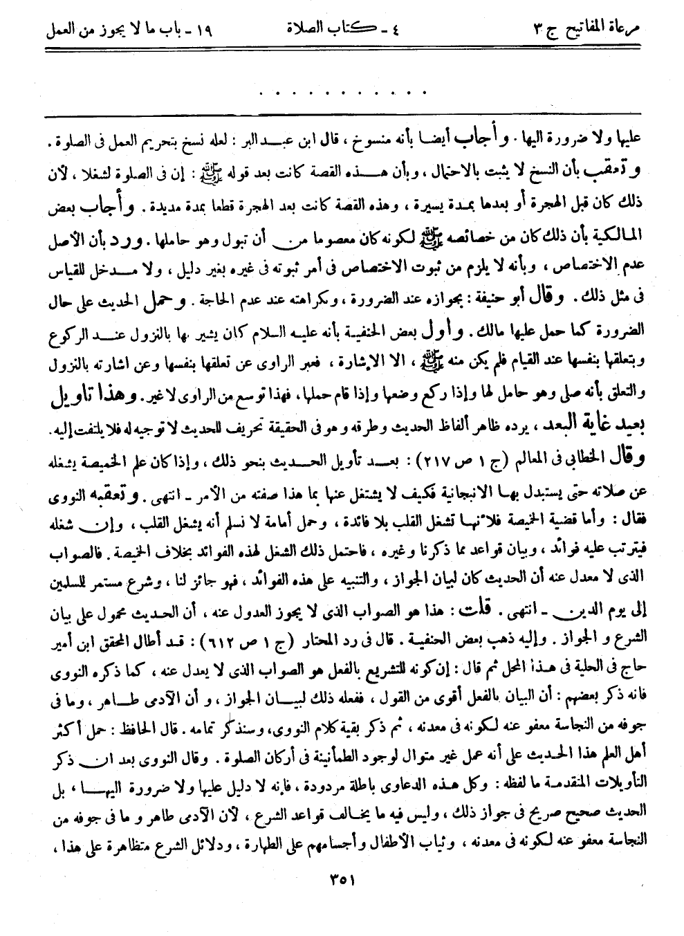 عليها ولا ضرورة إليها. وأجاب أيضاً بأنه منسوخ، قال ابن عبد البر: لعله نسخ بتحريم العمل في الصلاة. وتعقب بأن النسخ لا يثبت بالاحتمال، وبأن هذه القصة كانت بعد قوله - صلى الله عليه وسلم -: إن في الصلاة لشغلاً؛ لأن ذلك قبل الهجرة أو بعدها بمدة يسيرة، وهذه القصة كانت بعد الهجرة قطعاً بمدة مديدة. وأجاب بعض المالكية بأن ذلك كان من خصائصه - صلى الله عليه وسلم - لكونه معصوماً من أن تبول وهو حاملها. ورد بأن الأصل عدم الاختصاص، وبأنه لا يلزم من ثبوت الاختصاص في أمر ثبوته في غيره بغير دليل، ولا مدخل للقياس في مثل ذلك. وقال أبوحنيفة: بجوازه عند الضرورة، وبكراهته عند عدم الحاجة. وحمل الحديث على حال الضرورة كما حمل عليها مالك. وأول بعض الحنفية بأنه عليه السلام كان يشير بها بالنزول عند الركوع وبتعلقها بنفسها عند القيام، فلم يكن منه - صلى الله عليه وسلم - إلا الإشارة، فعبر الراوي عن تعلقها بنفسها وعن إشارته بالنزول والتعلق بأنه صلى وهو حامل لها وإذا ركع وضعها وإذا قام حملها، فهذا توسع من الراوي لا غير. وهذا تأويل بعيد غاية البعد، يرده ظاهر ألفاظ الحديث وطرقه وهو في الحقيقة تحريف للحديث لا توجيه له فلا يلتفت إليه. وقال الخطابي في المعالم (ج1 ص217) : بعد تأويل الحديث بنحو ذلك، وإذا كان علم الخميصة يشغله عن صلاته حتى يستبدل بها الأنبجانية فكيف لا يشتغل عنها بما هذا صفته من الأمر-انتهى. وتعقبه النووي فقال: وأما قضية الخميصة فلأنها تشغل القلب بلا فائدة، وحمل إمامة لا نسلم أنه يشغل القلب، وإن شغله فيترتب عليه فوائد، وبيان قواعد مما ذكرنا وغيره، فاحتمل ذلك الشغل لهذه الفوائد بخلاف الخميصة. فالصواب الذي لا معدل عنه أن الحديث كان لبيان الجواز، والتنبيه على هذه الفوائد، فهو جائز لنا، وشرع مستمر للمسلمين إلى يوم الدين-انتهى. قلت: هذا هو الصواب الذي لا يجوز العدول عنه، أن الحديث محمول على بيان الشرع والجواز. وإليه ذهب بعض الحنفية. قال في رد المحتار (ج1ص 612) : قد أطال المحقق ابن أمير حاج في الحلية في هذا المحل ثم قال: إن كونه للتشريع بالفعل هو الصواب الذي لا يعدل عنه، كما ذكره النووي فإنه ذكر بعضهم: أن البيان بالفعل أقوى من القول، ففعله ذلك لبيان الجواز، وأن الآدمي طاهر، وما في جوفه من النجاسة معفو عنه لكونه في معدنه، ثم ذكر بقية كلام النووي، وسنذكر تمامه. قال الحافظ: حمل أكثر أهل العلم هذا الحديث على أنه عمل غير متوال لوجود الطمأنينة في أركان الصلاة. وقال النووي بعد أن ذكر التأويلات المتقدمة ما لفظه: وكل هذه الدعاوي باطلة مردودة، فإنه لا دليل عليها ولا ضرورة إليها، بل الحديث صحيح صريح في جواز ذلك، وليس فيه ما يخالف قواعد الشرع؛ لأن الآدمي طاهر وما في جوفه من النجاسة معفو عنه لكونه في معدنه، وثياب الأطفال وأجسامهم على الطهارة، ودلائل الشرع متظاهرة على هذا،