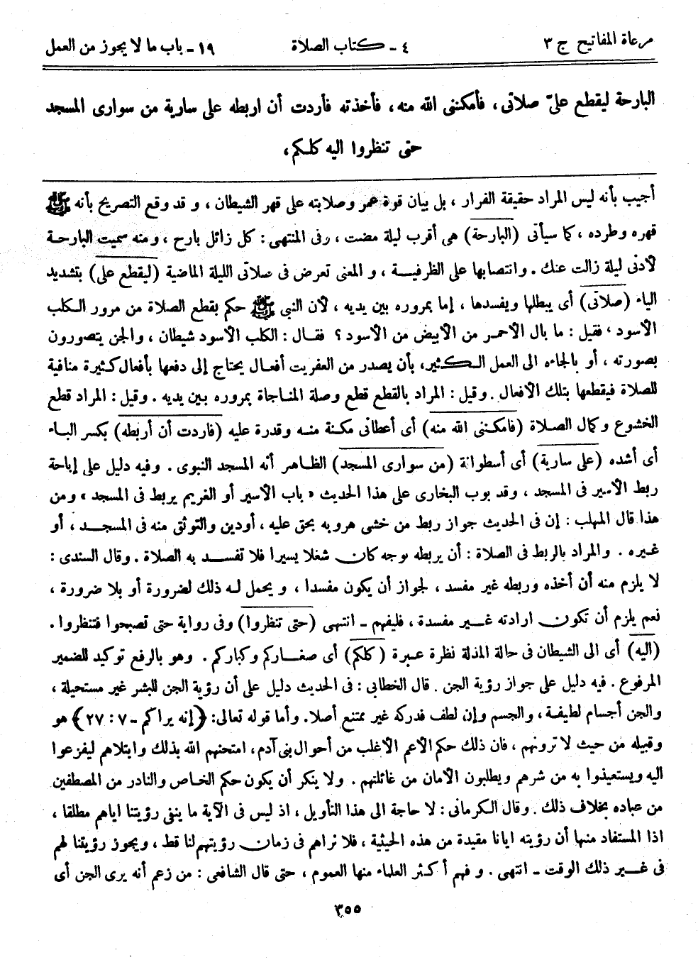 أجيب بأنه ليس المراد حقيقة الفرار، بل بيان قوة عمر وصلابته على قهر الشيطان، وقد وقع التصريح بأنه - صلى الله عليه وسلم - قهره وطرده، كما سيأتي. (البارحة) هي أقرب ليلة مضت، وفي المنتهى: كل زائل بارح، ومنه سميت البارحة لأدنى ليلة زالت عنك. وانتصابها على الظرفية، والمعنى تعرض في صلاتي الليلة الماضية. (ليقطع علي) بتشديد الياء (صلاتي) أي يبطلها ويفسدها، إما بمروره بين يديه؛ لأن النبي - صلى الله عليه وسلم - حكم بقطع الصلاة من مرور الكلب الأسود، فقيل: ما بال الأحمر من الأبيض من الأسود؟ فقال: الكلب الأسود شيطان، والجن يتصورون بصورته، أو بإلجائه إلى العمل الكثير، بأن يصدر من العفريت أفعال يحتاج إلى دفعها بأفعال كثيرة منافية للصلاة فيقطعها بتلك الأفعال. وقيل: المراد بالقطع قطع وصلة المناجاة بمروره بين يديه. وقيل: المراد قطع الخشوع وكمال الصلاة. (فأمكنني الله منه) أي أعطاني مكنة منه وقدرة عليه. (فأردت أن أربطه) بكسر الباء أي أشده. (على سارية) أي أسطوانة. (من سواري المسجد) الظاهر أنه المسجد النبوي. وفيه دليل على إباحة ربط الأسير في المسجد، وقد بوب البخاري على هذا الحديث "باب الأسير أو الغريم يربط في المسجد". ومن هذا قال المهلب: إن في الحديث جواز ربط من خشي هروبه بحق عليه، أو دين والتوثق منه في المسجد، أو غيره. والمراد بالربط في الصلاة: أن يربطه بوجه كان شغلاً يسيراً فلا تفسد به الصلاة. وقال السندي: لا يلزم منه أن أخذه وربطه غير مفسد، لجواز أن يكون مفسداً، ويحمل له ذلك لضرورة أو بلا ضرورة، نعم يلزم أن تكون إرادته غير مفسدة، فليفهم-انتهى. (حتى تنظروا) وفي رواية حتى تصبحوا فتنظروا. (إليه) أي إلى الشيطان في حالة المذلة نظرة عبرة. (كلكم) أي صغاركم وكباركم. وهو بالرفع توكيد للضمير المرفوع. فيه دليل على جواز رؤية الجن. قال الخطابي: في الحديث دليل على أن رؤية الجن للبشر غير مستحيلة، والجن أجسام لطيفة، والجسم وإن لطف فدركه غير ممتنع أصلاً. وأما قوله تعالى: {إنه يراكم هو وقبيله من حيث لا ترونهم} [7: 27] ، فإن ذلك حكم الأعم الأغلب من أحوال بني آدم، امتحنهم الله بذلك وابتلاهم ليفزعوا إليه ويستعيذوا به من شرهم ويطلبون الأمان من غائلتهم. ولا ينكر أن يكون حكم الخاص والنادر من المصطفين من عباده بخلاف ذلك. وقال الكرماني: لا حاجة إلى هذا التأويل، إذ ليس في الآية ما ينفي رؤيتنا إياهم مطلقاً، إذا المستفاد منها أن رؤيته إيانا مقيدة من هذه الحيثية، فلا نراهم في زمان رؤيتهم لنا قط، ويجوز رؤيتنا لهم في غير ذلك الوقت-انتهى. وفهم أكثر العلماء منها العموم، حتى قال الشافعي: من زعم أنه يرى الجن أي