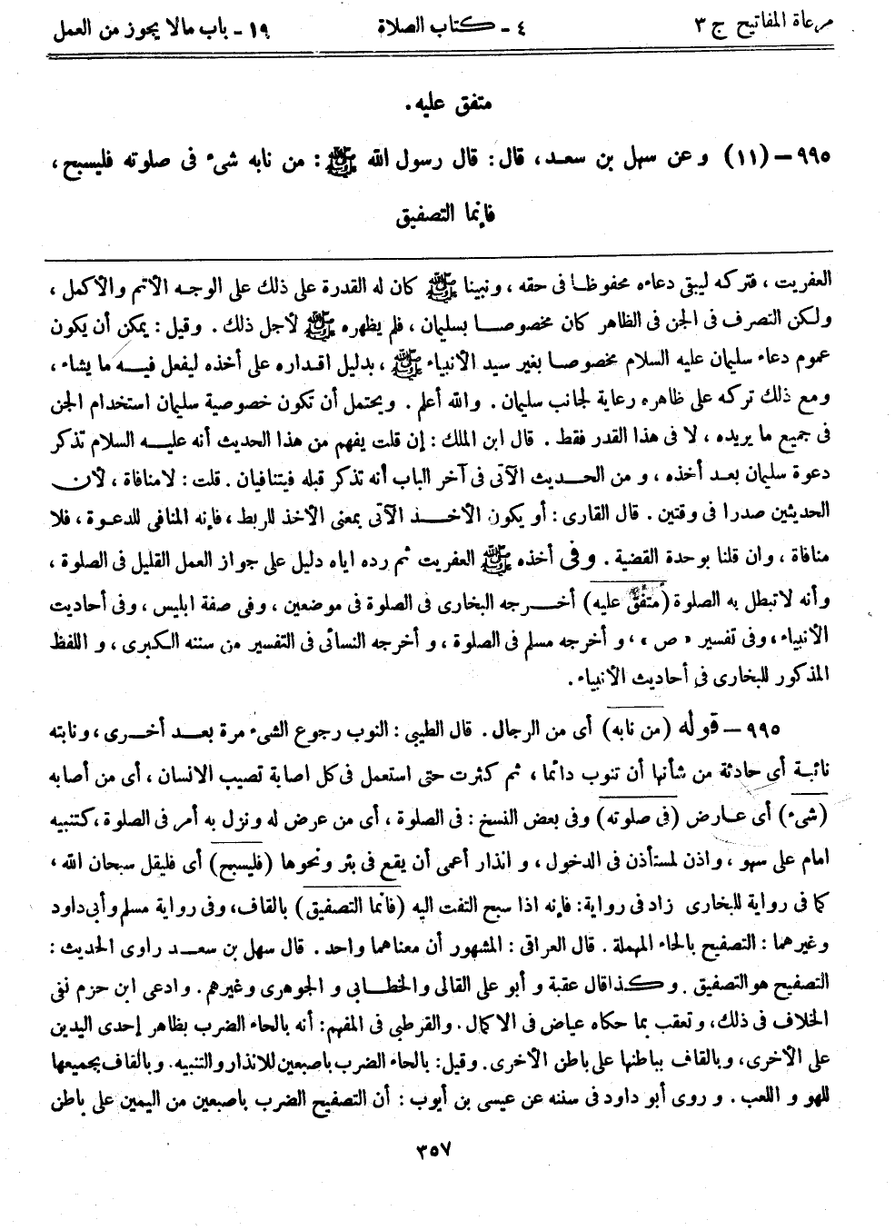 995- قوله: (من نابه) أي من الرجال. قال الطيبي: النوب رجوع الشيء مرة بعد أخرى، ونابته نائبة أي حادثة من شأنها أن تنوب دائماً، ثم كثرت حتى استعمل في كل إصابة تصيب الإنسان، أي من أصابه. (شيء) أي عارض. (في صلاته) وفي بعض النسخ: في الصلاة، أي من عرض له ونزل به أمر في الصلاة، كتنبيه إمام على سهو، وإذن لمستأذن في الدخول، وإنذار أعمى أن يقع في بئر ونحوها. (فليسبح) أي فليقل سبحان الله، كما في رواية للبخاري زاد في رواية: فإنه إذا سبح التفت إليه. (فإنما التصفيق) بالقاف، وفي رواية مسلم وأبي داود وغيرهما: التصفيح بالحاء المهملة. قال العراقي: المشهور أن معناهما واحد. قال سهل بن سعد راوي الحديث: التصفيح هو التصفيق. وكذا قال عقبة وأبوعلي القالي والخطابي والجوهري وغيرهم. وادعى ابن حزم نفي الخلاف في ذلك، وتعقب بما حكاه عياض في الإكمال. والقرطبي في المفهم: أنه بالحاء الضرب بظاهر إحدى اليدين على الأخرى، وبالقاف بباطنها على باطن الأخرى. وقيل: بالحاء الضرب بإصبعين للإنذار والتنبيه. وبالقاف بجميعها للهو واللعب. وروى أبوداود في سننه عن عيسى بن أيوب: أن التصفيح الضرب بإصبعين من اليمين على باطن