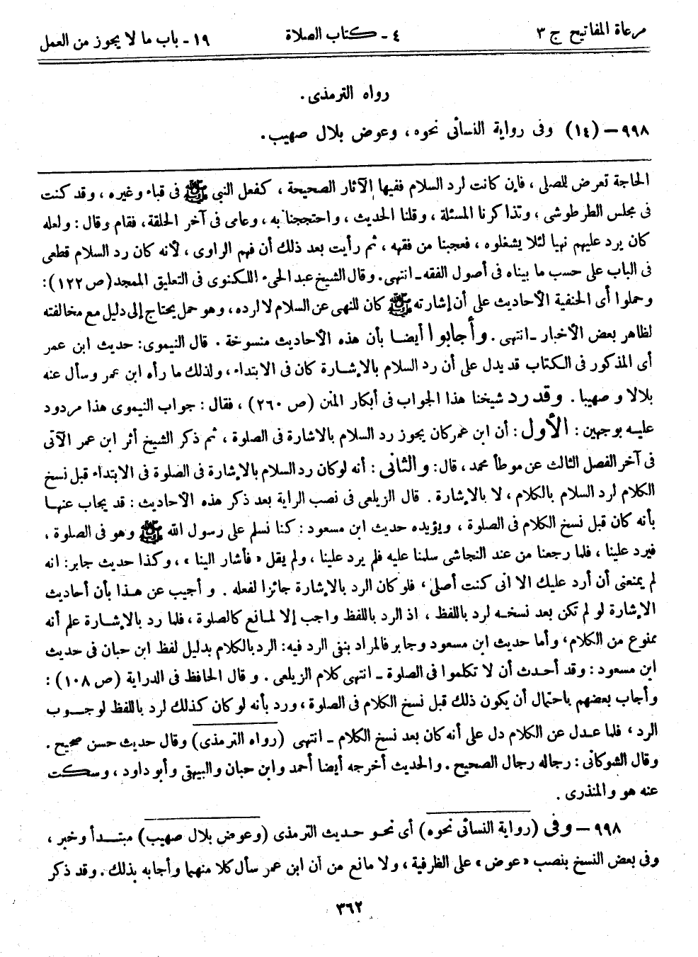 الحاجة تعرض للمصلي، فإن كانت لرد السلام ففيها الآثار الصحيحة، كفعل النبي - صلى الله عليه وسلم - في قباء وغيره، وقد كنت في مجلس الطرطوشي، وتذاكرنا المسألة، وقلنا الحديث، واحتججنا به، وعامي في آخر الحلقة، فقام وقال: ولعله كان يرد عليهم نهياً لئلا يشغلوه، فعجبنا من فقهه، ثم رأيت بعد ذلك أن فهم الراوي؛ لأنه كان رد السلام قطعي في الباب على حسب ما بيناه في أصول الفقه-انتهى. وقال الشيخ عبد الحي اللكنوي في التعليق الممجد (ص122) : وحملوا أي الحنفية الأحاديث على أن إشارته - صلى الله عليه وسلم - كان للنهي عن السلام لا لرده، وهو حمل يحتاج إلى دليل مع مخالفته لظاهر بعض الأخبار-انتهى. وأجابوا أيضاً بأن هذه الأحاديث منسوخة. قال النيموي: حديث ابن عمر أي المذكور في الكتاب قد يدل على أن رد السلام بالإشارة كان في الابتداء، ولذلك ما رآه ابن عمر وسأل عنه بلالاُ وصهيباُ. وقد رد شيخنا هذا الجواب في أبكار المنن (ص260) ، فقال: جواب النيموي هذا مردود عليه بوجهين: الأول: أن ابن عمر كان يجوز رد السلام بالإشارة في الصلاة، ثم ذكر الشيخ أثر ابن عمر الآتي في آخر الفصل الثالث عن موطأ محمد، قال: والثاني: أنه لو كان رد السلام بالإشارة في الصلاة في الابتداء قبل نسخ الكلام لرد السلام بالكلام، لا بالإشارة. قال الزيلعي في نصب الراية بعد ذكر هذه الأحاديث: قد يجاب عنها بأنه كان قبل نسخ الكلام في الصلاة، ويؤيده حديث ابن مسعود: كنا نسلم على رسول الله - صلى الله عليه وسلم - وهو في الصلاة، فيرد علينا، فلما رجعنا من عند النجاشي سلمنا عليه فلم يرد علينا، ولم يقل "فأشار إلينا"، وكذا حديث جابر: إنه لم يمنعني أن أرد عليك إلا إني كنت أصلي، فلو كان الرد بالإشارة جائزاً لفعله. وأجيب عن هذا بأن أحاديث الإشارة لو لم تكن بعد نسخه لرد باللفظ، إذ الرد باللفظ واجب إلا لمانع كالصلاة، فلما رد بالإشارة علم أنه ممنوع من الكلام، وأما حديث ابن مسعود وجابر فالمراد بنفي الرد فيه: الرد بالكلام بدليل لفظ ابن حبان في حديث ابن مسعود: وقد أحدث أن لا تكلموا في الصلاة- انتهى كلام الزيلعي. وقال الحافظ في الدراية (ص108) : وأجاب بعضهم باحتمال أن يكون ذلك قبل نسخ الكلام في الصلاة، ورد بأنه لو كان كذلك لرد باللفظ لوجوب الرد، فلما عدل عن الكلام دل على أنه كان بعد نسخ الكلام-انتهى. (رواه الترمذي) وقال حديث حسن صحيح. وقال الشوكاني: رجاله رجال الصحيح. والحديث أخرجه أيضاً أحمد وابن حبان والبيهقي وأبوداود، وسكت عنه هو والمنذري.