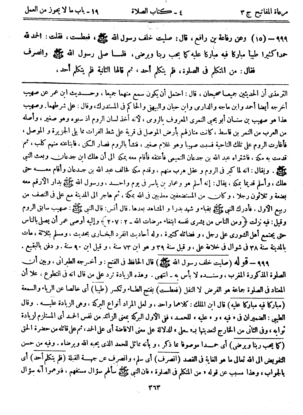999- (15) وعن رفاعة بن رافع، قال: ((صليت خلف رسول الله - صلى الله عليه وسلم -، فعطست، فقلت: الحمد لله حمداً كثيراً طيباً مباركاً فيه مباركاً عليه كما يحب ربنا ويرضى، فلما صلى رسول الله - صلى الله عليه وسلم - وانصرف فقال: من المتكلم في الصلاة؟ فلم يتكلم أحد، ثم قالها الثانية، فلم يتكلم أحد،