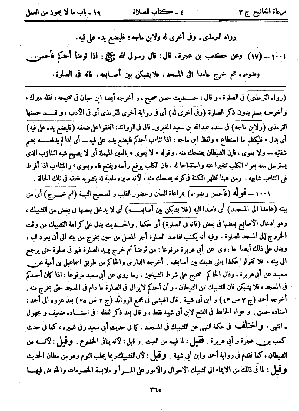1001- (17) عن كعب بن عجرة، قال: قال رسول الله - صلى الله عليه وسلم -: ((إذا توضأ أحدكم فأحسن وضوءه، ثم خرج عامداً إلى المسجد، فلا يشبكن بين أصابعه، فإنه في الصلاة))