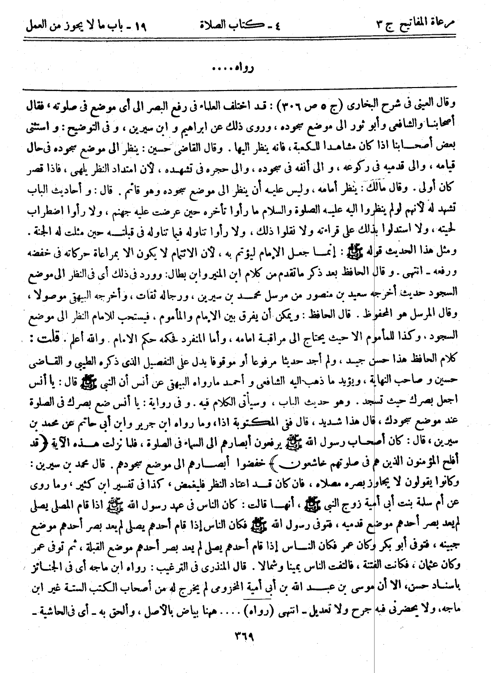 وقال العيني في شرح البخاري (ج5 ص306) : قد اختلف العلماء في رفع البصر إلى أي موضع في صلاته، فقال أصحابنا والشافعي وأبوثور إلى موضع سجوده، وروي ذلك عن إبراهيم وابن سيرين، وفي التوضيح: واستثنى بعض أصحابنا إذا كان مشاهداً للكعبة، فإنه ينظر إليها. وقال القاضي حسين: ينظر إلى موضع سجوده في حال قيامه، وإلى قدميه في ركوعه، وإلى أنفه في سجوده، وإلى حجره في تشهده؛ لأن امتداد النظر يلهي، فإذا قصر كان أولى. وقال مالك: ينظر أمامه، وليس عليه أن ينظر إلى موضع سجوده وهو قائم. قال: وأحاديث الباب تشهد له؛ لأنهم لو لم ينظروا إليه عليه الصلاة والسلام ما رأوا تأخره حين عرضت عليه جهنم، ولا رأوا اضطراب لحيته، ولا استدلوا بذلك على قراءته ولا نقلوا ذلك، ولا رأوا تناوله فيما تناوله في قبلته حين مثلت له الجنة. ومثل هذا الحديث قوله - صلى الله عليه وسلم -: إنما جعل الإمام ليؤتم به؛ لأن الائتمام لا يكون إلا بمراعاة حركاته في خفضه ورفعه – انتهى. وقال الحافظ بعد ذكر ما تقدم من كلام ابن المنير وابن بطال: وورد في ذلك أي في النظر إلى موضع السجود حديث أخرجه سعيد بن منصور من مرسل محمد بن سيرين، ورجاله ثقات، وأخرجه البيهقي موصولاً، وقال: المرسل هو المحفوظ. قال الحافظ: ويمكن أن يفرق بين الإمام والمأموم، فيستحب للإمام النظر إلى موضع السجود، وكذا للمأموم إلا حيث يحتاج إلى مراقبة إمامه، وأما المنفرد فحكمه حكم الإمام. والله أعلم. قلت: كلام الحافظ هذا حسن جيد، ولم أجد حديثاً مرفوعاً أو موقوفاً يدل على التفصيل الذي ذكره الطيبي والقاضي حسين وصاحب النهاية، ويؤيد ما ذهب إليه الشافعي وأحمد ما رواه البيهقي عن أنس أن النبي - صلى الله عليه وسلم - قال: يا أنس اجعل بصرك حيث تسجد. وهو حديث الباب، وسيأتي الكلام فيه. وفي رواية: يا أنس ضع بصرك في الصلاة عند موضع سجودك، قال هذا شديد، قال ففي المكتوبة إذا، وما رواه ابن جرير وابن أبي حاتم عن محمد بن سيرين، قال: كان أصحاب رسول الله - صلى الله عليه وسلم - يرفعون أبصارهم إلى السماء في الصلاة، فلما نزلت هذه الآية: {قد أفلح المؤمنون الذين هم في صلاتهم خاشعون} خفضوا أبصارهم إلى موضع سجودهم. قال محمد بن سيرين: وكانوا يقولون لا يجاوز بصره مصلاه، فإن كان قد اعتاد النظر فليغمض، كذا في تفسير ابن كثير، وما روي عن أم سلمة بنت أبي أمية زوج النبي - صلى الله عليه وسلم -، أنها قالت: كان الناس في عهد رسول الله - صلى الله عليه وسلم - إذا قام المصلي يصلي لم يعد بصر أحدهم موضع قدميه، فتوفي رسول الله - صلى الله عليه وسلم - فكان الناس إذا قام أحدهم يصلي لم يعد بصر أحدهم موضع جبينه، فتوفي أبوبكر وكان عمر فكان الناس إذا قام أحدهم يصلي لم يعد بصر أحدهم موضع القبلة، ثم توفي عمر وكان عثمان، فكانت الفتنة، فالتفتت الناس يميناً وشمالاً. قال المنذري في الترغيب: رواه ابن ماجه أي في الجنائز بإسناد حسن، إلا أن موسى بن عبد الله بن أبي أمية المخزومي لم يخرج له من أصحاب الكتب الستة غير ابن ماجه، ولا يحضرني فيه جرح ولا تعديل- انتهى. (رواه) . . . .ههنا بياض بالأصل، وألحق به- أي في الحاشية-