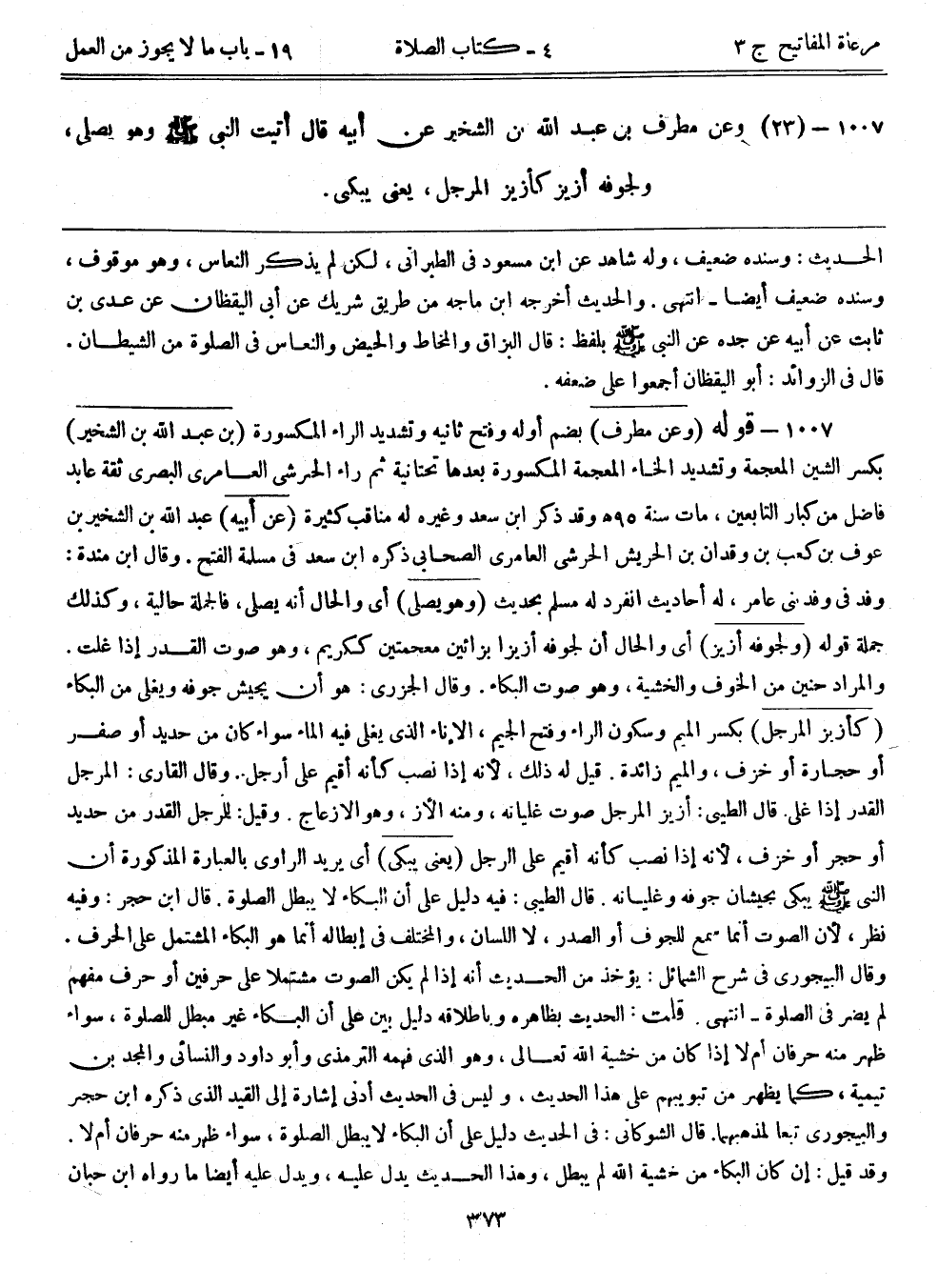 1007- (23) وعن مطرف بن عبد الله بن الشخير عن أبيه قال: ((أتيت النبي - صلى الله عليه وسلم - وهو يصلي، ولجوفه أزيز كأزيز المرجل، يعني يبكي.