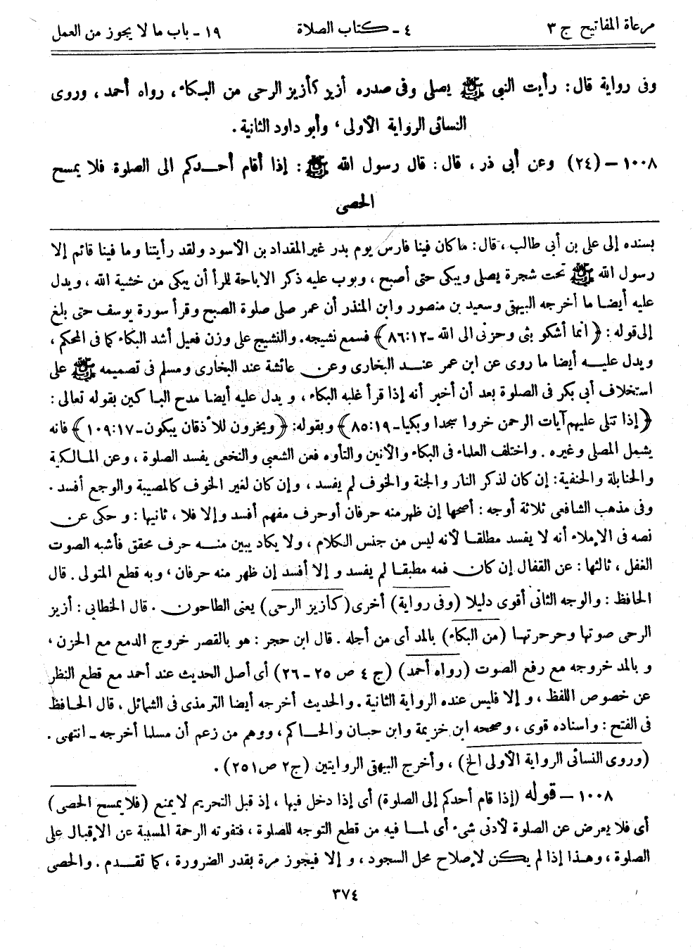 1008- قوله: (إذا قام أحدكم إلى الصلاة) أي إذا دخل فيها، إذ قبل التحريم لا يمنع. (فلا يمسح الحصى) أي فلا يعرض عن الصلاة لأدنى شيء، أي لما فيه من قطع التوجه للصلاة، فتفوته الرحمة المسببة عن الإقبال على الصلاة، وهذا إذا لم يكن لإصلاح محل السجود، وإلا فيجوز مرة بقدر الضرورة، كما تقدم. والحصى