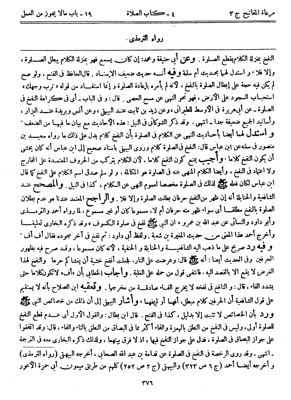 النفخ بمنزلة الكلام يقطع الصلاة. وعن أبي حنيفة ومحمد: إن كان يسمع فهو بمنزلة الكلام يبطل الصلاة، وإلا فلا، واستدل لهما بحديث أم سلمة وفيه أنه حديث ضعيف الإسناد. قال الحافظ في الفتح: ولو صح لم يكن فيه حجة على إبطال الصلاة بالنفخ؛ لأنه لم يأمره بإعادة الصلاة، وإنما استفاد من قوله: "ترب وجهك" استحباب السجود على الأرض، فهو نحو النهي عن مسح الحصى. قال: وفي الباب- أي في كراهة النفخ في الصلاة- عن أبي هريرة في الأوسط للطبراني، وعن زيد بن ثابت عند البيهقي، وعن أنس وبريدة عند البزار، وأسانيد الجميع ضعيفة جداً-انتهى. وقد ذكر الشوكاني في النيل: هذه الأحاديث مع بيان ما فيها من الضعف. واستدل لهما أيضاً بأحاديث النهي عن الكلام في الصلاة بأن النفخ كلام يدل على ذلك ما رواه سعيد بن منصور في سننه عن ابن عباس قال: النفخ في الصلاة كلام وروى البيهقي بإسناد صحيح إلى ابن عباس أنه كان يخشى أن يكون النفخ كلاماً. وأجيب بمنع كون النفخ كلاماً؛ لأن الكلام يتركب من الحروف المعتمدة على المخارج ولا اعتماد في النفخ، وأيضاً الكلام المنهي عنه في الصلاة هو المكالمة، ولو سلم صدق اسم الكلام على النفخ كما قال ابن عباس لكان فعله - صلى الله عليه وسلم - لذلك في الصلاة مخصصاً لعموم النهي عن الكلام، كذا في النيل. والمصحح عند الشافعية والحنابلة أنه إن ظهر من النفخ حرفان بطلت الصلاة وإلا فلا. والراجح المعتمد عندنا هو عدم بطلان الصلاة بالنفخ مطلقاً، أي سواء ظهر منه حرفان أم لا، مسموعاً كان أو غير مسموع، لما رواه أحمد والترمذي وأبوداود والنسائي عن عبد الله بن عمرو "أن النبي - صلى الله عليه وسلم - نفخ في صلاة الكسوف"، وقد ذكره البخاري تعليقاً. وأخرج أحمد هذا المعنى من حديث المغيرة بن شعبة. ولفظ أبي داود: ثم نفخ في آخر سجوده فقال: أف أف. وفيه رد صريح على ما ذهب إليه الشافعية والحنابلة والحنفية؛ لأنه كان مسموعاً، وقد صرح فيه بظهور الحرفين وفي الحديث أيضاً: أنه - صلى الله عليه وسلم - قال: وعرضت على النار، فجعلت أنفخ خشية أن يغشاكم حرها، والنفخ لهذا الغرض لا يقع إلا بالقصد إليه، فانتفى قول من حمله على الغلبة. وأجاب الخطابي بأن "أف" لا تكون كلاماً حتى يشدد الفاء، قال: والنافخ في نفخه لا يخرج الفاء صادقة من خرجها. وتعقبه ابن الصلاح بأنه لا يستقيم على قول الشافعية أن الحرفين كلام مبطل، أفهما أولم يفهما، وأشار البيهقي إلى أن ذلك من خصائص النبي - صلى الله عليه وسلم -، ورد بأن الخصائص لا تثبت إلا بدليل، كذا في الفتح. قال ابن بطال: والقول الأول أي عدم قطع النفخ للصلاة أولى، وليس في النفخ من النطق بالهمزة والفاء أكثر مما في البصاق من النطق بالتاء والفاء، قال: وقد اتفقوا على جواز البصاق في الصلاة، فدل على جواز النفخ فيها، إذ لا فرق بينهما، ولذلك ذكره البخاري معه في الترجمة –انتهى. وقد روي الرخصة في النفخ في الصلاة عن قدامة بن عبد الله الصحابي، أخرجه البيهقي. (رواه الترمذي) وأخرجه أيضاً أحمد (ج6: ص323) والبيهقي (ج2: ص252) كلهم من طريق ميمون أبي حمزة الأعور