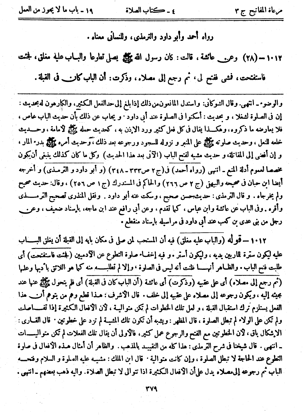 1012- قوله: (والباب عليه مغلق) فيه أن المستحب لمن صلى في مكان بابه إلى القبلة أن يغلق الباب عليه ليكون سترة للمار بين يديه، وليكون أستر. وفيه إخفاء صلاة التطوع عن الآدميين. (فجئت فاستفتحت) أي طلبت فتح الباب، والظاهر أنها ظنت أنه ليس في الصلاة، وإلا لم تطلبه منه كما هو اللائق بأدبها وعلمها. (ثم رجع إلى مصلاه) أي على عقبيه. (وذكرت) أي عائشة. (أن الباب كان في القبلة) أي فلم يتحول - صلى الله عليه وسلم - عنها عند مجيئه إليه، ويكون رجوعه إلى مصلاه على عقبيه إلى خلف. قال الأشرف: هذا قطع وهم من يتوهم أن هذا الفعل يستلزم ترك استقبال القبلة، ولعل تلك الخطوات لم تكن متوالية؛ لأن الأفعال الكثيرة إذا تفاصلت ولم تكن على الولاء لم تبطل الصلاة، قال المظهر: ويشبه أن تكون تلك المشية لم تزد على خطوتين. قال القاري: الإشكال باق؛ لأن الخطوتين مع الفتح والرجوع عمل كثير، فالأولى أن يقال تلك الفعلات لم تكن متواليات –انتهى. قال شيخنا في شرح الترمذي: هذا كله من التقييد بالمذهب. والظاهر أن أمثال هذه الأفعال في صلاة التطوع عند الحاجة لا تبطل الصلاة، وإن كانت متوالية. قال ابن الملك: مشيه عليه الصلاة والسلام وفتحه الباب ثم رجوعه إلى مصلاه يدل على أن الأفعال الكثيرة إذا تتوالى لا تبطل الصلاة. وإليه ذهب بعضهم-انتهى.