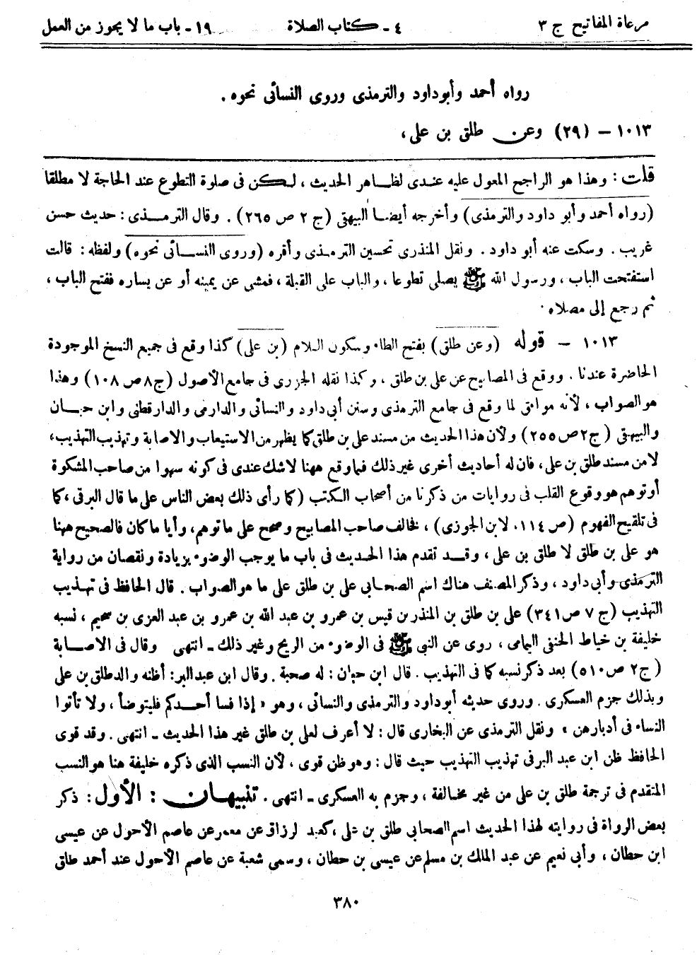 1013- قوله: (وعن طلق) بفتح الطاء وسكون اللام. (بن علي) كذا وقع في جميع النسخ الموجودة الحاضرة عندنا. ووقع في المصابيح عن علي بن طلق، وكذا نقله الجزري في جامع الأصول (ج8:ص108) وهذا هو الصواب؛ لأنه موافق لما وقع في جامع الترمذي وسنن أبي داود والنسائي والدارمي والدارقطني وابن حبان والبيهقي (ج2:ص255) ؛ ولأن هذا الحديث من مسند علي بن طلق كما يظهر من الاستيعاب والإصابة وتهذيب التهذيب، لا من مسند طلق بن علي، فإن له أحاديث أخرى غير ذلك، فما وقع ههنا لا شك عندي في كونه سهواً من صاحب المشكاة أو توهم هو وقوع القلب في روايات من ذكرنا من أصحاب الكتب. (كما رأى بعض الناس على ما قال البرقي، كما في تلقيح الفهوم (ص114، لابن الجوزي) ، فخالف صاحب المصابيح، وصحح على ما توهم، وأياما كان فالصحيح ههنا هو علي بن طلق لا طلق بن علي، وقد تقدم هذا الحديث في باب ما يوجب الوضوء بزيادة ونقصان من رواية الترمذي وأبي داود، وذكر المصنف هناك اسم الصحابي علي بن طلق على ما هو الصواب. قال الحافظ في تهذيب التهذيب (ج7: ص341) علي بن طلق بن المنذر بن قيس بن عمرو بن عبد الله بن عمرو بن عبد العزى بن سحيم، نسبه خليفة بن خياط الحنفي اليمامي، روى عن النبي - صلى الله عليه وسلم - في الوضوء من الريح وغير ذلك-انتهى. وقال في الإصابة (ج2:ص510) بعد ذكر نسبه كما في التهذيب. قال ابن حبان: له صحبة. وقال ابن عبد البر: أظنه والد طلق بن علي، وبذلك جزم العسكري. وروى حديث أبوداود والترمذي والنسائي، وهو "إذا فسا أحدكم فليتوضأ، ولا تأتوا النساء في أدبارهن" ونقل الترمذي عن البخاري قال: لا أعرف لعلي بن طلق غير هذا الحديث-انتهى. وقد قوي الحافظ ظن ابن عبد البر في تهذيب التهذيب حيث قال: وهو ظن قوي؛ لأن النسب الذي ذكره خليفة هنا هو النسب المتقدم في ترجمة طلق بن علي من غير مخالفة، وجزم به العسكري-انتهى. تنبيهان: الأول: ذكر بعض الرواة في روايته لهذا الحديث اسم الصحابي طلق بن علي، كعبدلرزاق عن معمر عن عاصم الأحول عن عيسى بن حطان، وأبي نعيم عن عبد الملك بن مسلم عن عيسى بن حطان، وسمى شعبة عن عاصم الأحول عند أحمد طلق