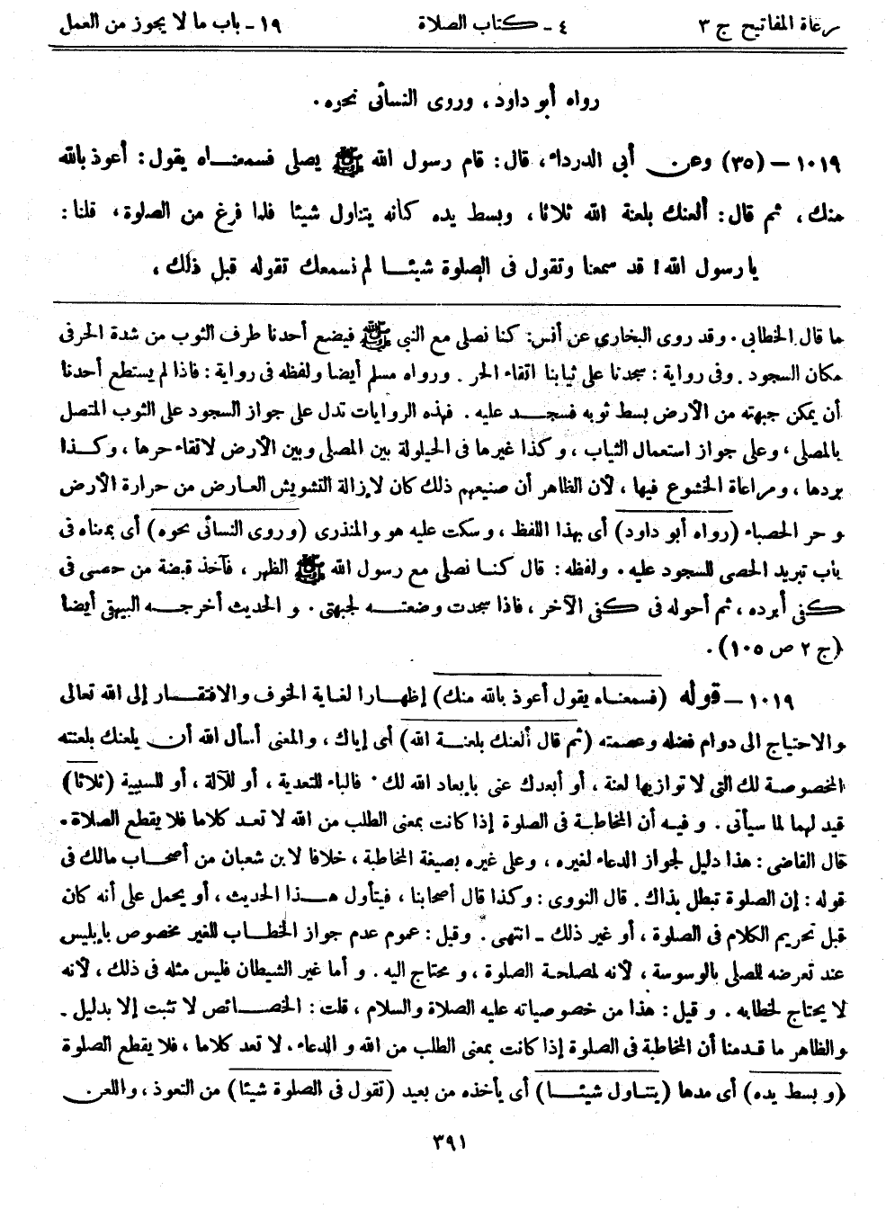 1019- (35) وعن أبي الدرداء، قال: ((قام رسول الله - صلى الله عليه وسلم - يصلي فسمعناه يقول: أعوذ بالله منك، ثم قال: ألعنك بلعنة الله ثلاثاً، وبسط يده كأنه يتناول شيئاً، فلما فرغ من الصلاة، قلنا: يا رسول الله! قد سمعنا وتقول في الصلاة شيئاً لم نسمعك تقوله قبل ذلك،