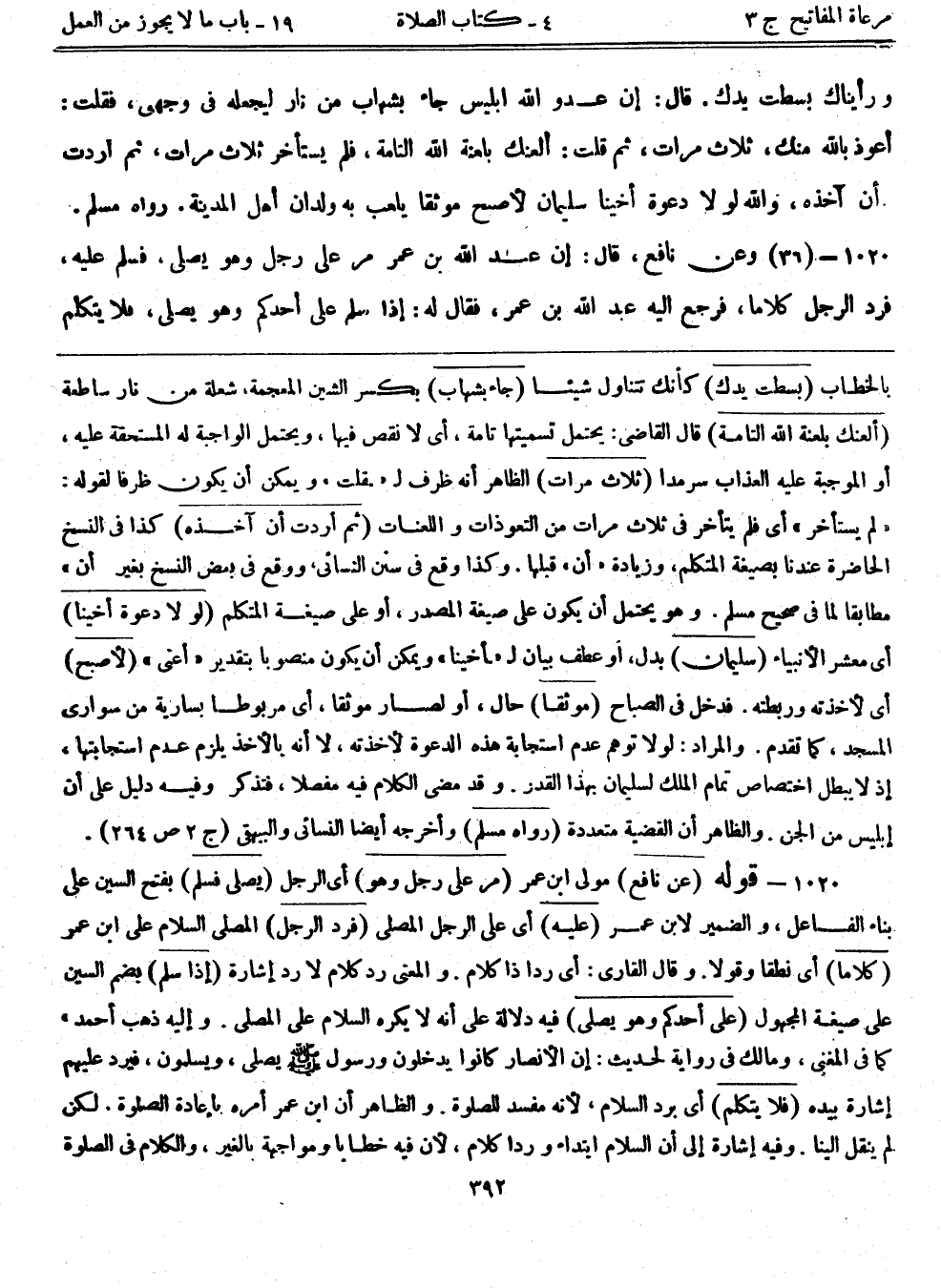 1020- قوله: (عن نافع) مولى ابن عمر. (مر علي رجل) أي الرجل. (يصلي فسلم) بفتح السين على بناء الفاعل، والضمير لابن عمر. (عليه) أي على الرجل المصلي. (فرد الرجل) المصلي السلام على ابن عمر. (كلاماً) أي نطقاً وقولاً. وقال القاري: أي رداً ذا كلام. والمعنى رد كلام لا رد إشارة. (إذا سلم) بضم السين على صيغة المجهول. (على أحدكم وهو يصلي) فيه دلالة على أنه لا يكره السلام على المصلي. وإليه ذهب أحمد كما في المغني، ومالك في رواية لحديث: إن الأنصار كانوا يدخلون ورسول الله - صلى الله عليه وسلم - يصلي، ويسلمون، فيرد عليهم إشارة بيده. (فلا يتكلم) أي برد السلام؛ لأنه مفسد للصلاة. والظاهر أن ابن عمر أمره بإعادة الصلاة. لكن لم ينقل إلينا. وفيه إشارة إلى أن السلام ابتداء ورداً كلام؛ لأن فيه خطاباً ومواجهة بالغير، والكلام في الصلاة