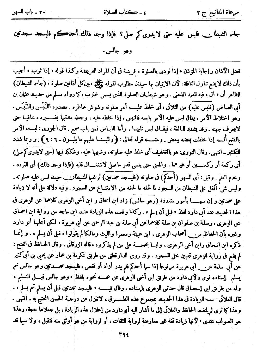 فضل الأذان وإجابة المؤذن "إذا نودي بالصلاة" قرينة في أن المراد الفريضة، وكذا قوله "إذا ثوب"، أجيب بأن ذلك لا يمنع تناول النافلة؛ لأن الإتيان بها حينئذٍ مطلوب لقوله - صلى الله عليه وسلم -: "بين كل أذانين صلاة". (جاءه الشيطان) الظاهر أن "ال" فيه للعهد الذهني. وهو شيطان الصلاة الذي يسمى خنزب، كما رواه مسلم من حديث عثمان بن أبي العاص. (فلبس عليه) من الثلاثي، أي خلط عليه أمر صلاته وشوش خاطره. مصدره اللبس واللبس. وهو اختلاط الأمر، يقال لبس عليه الأمر يلبسه فالتبس، إذا خلطه عليه، وجعله مشتبهاً بغيره، خافياً حتى لا يعرف جهته. وقد يشدد للمبالغة، فيقال: لبس تلبيساً، وأما اللباس فمن باب سمع. قال الجزري: لبست الأمر بالفتح ألبسه، إذا خلطت بعضه ببعض. ومنه قوله تعالى: {وللبسنا عليهم ما يلبسون} [6: 9] . وربما شدد للتكثير-انتهى. وقال النووي: هو بالتخفيف أي خلط عليه صلاته، وشبهها عليه، وشككه فيها. (حتى لا يدري كم صلى) أي ركعة أو ركعتين أو غيرهما. والمعنى حتى ينسى قدر ما صلى لاشتغال قلبه. (فإذا وجد ذلك) أي التردد، وعدم العلم. وقيل: السهو. (أحدكم) في صلاته. (فليسجد سجدتين) ترغيماً للشيطان حيث لبس عليه صلاته. وليس شيء أثقل على الشيطان من السجود لما لحقه ما لحقه من الامتناع عن السجود. وفيه دلالة على أنه لا زيادة على سجدتين وإن سها بأمور متعددة. (وهو جالس) زاد ابن إسحاق وابن أخي الزهري كلاهما عن الزهري في هذا الحديث عند أبي داود لفظ "قبل أن يسلم". وكذا وقعت هذه الزيادة عند ابن ماجه من رواياته ابن إسحاق عن الزهري، وسلمة بن صفوان بن سلمة كلاهما عن أبي سلمة بن عبد الرحمن عن أبي هريرة، لكن أعلها أبوداود وغيره بأن الحفاظ من أصحاب الزهري، ابن عيينة ومعمراً والليث ومالكاً لم يقولوا "قبل أن يسلم". وإنما ذكره ابن إسحاق وابن أخي الزهري، وليسا بحجة على من لم يذكروه، قاله الزرقاني. وقال الحافظ في الفتح: لم يقع في رواية الزهري تعيين محل السجود. وقد روى الدارقطني من طريق عكرمة بن عمار عن يحيى بن أبي كثير عن أبي سلمة عن أبي هريرة مرفوعاً إذا سها أحدكم فلم يدر أزاد أو نقص، فليسجد سجدتين وهو جالس ثم يسلم. إسناده قوي ولأبي داود من طريق ابن أخي الزهري عن عمه نحوه بلفظ "وهو جالس قبل التسليم". وله من طريق ابن إسحاق قال حدثني الزهري بإسناده، وقال فيه "فليسجد سجدتين قبل أن يسلم ثم يسلم". قال العلائي: سنده الزيادة في هذا الحديث بمجموع هذه الطرق، لا تنزل عن درجة الحسن المحتج به-انتهى. وهذا كما ترى لم يلتفت الحافظ والعلائي إلى ما أشار إليه أبوداود من إعلال هذه الزيادة، بل جعلاها حجة، وهذا هو الصواب عندي؛ لأنها زيادة ثقة غير معارضة لرواية الثقات، أو لرواية من هو أوثق منه فتقبل، ولا سيما قد