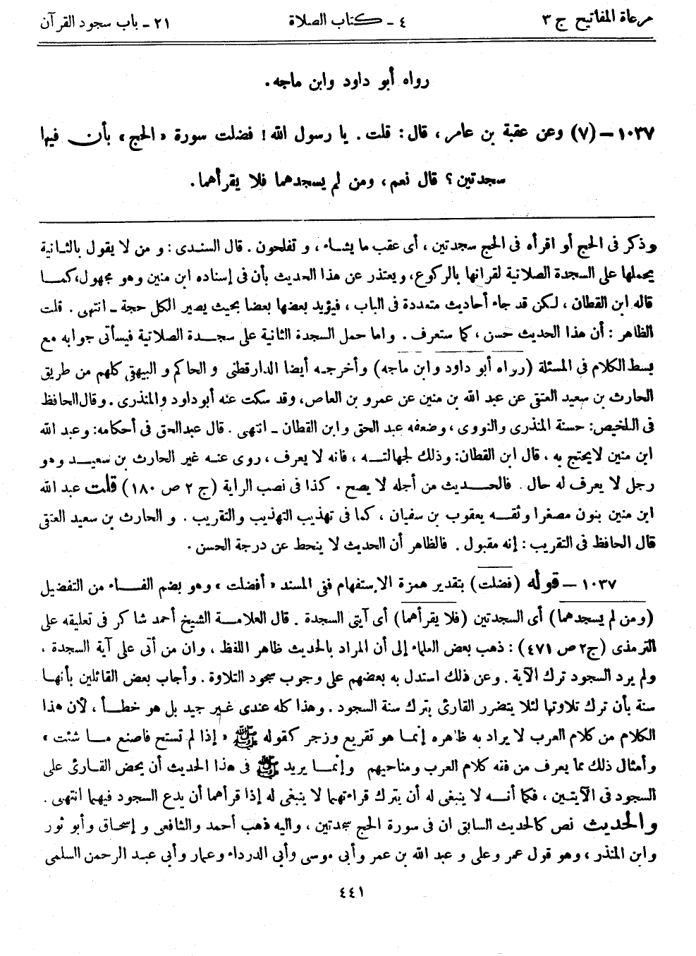 1037- (7) وعن عقبة بن عامر، قال: ((قلت. يا رسول الله! فضلت سورة "الحج" بأن فيها سجدتين؟ قال نعم، ومن لم يسجدها فلا يقرأ هما))