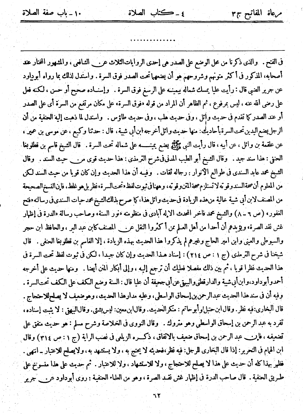 في الفتح. والذي ذكرنا من محل الوضع على الصدر هي إحدى الروايات الثلاث عن الشافعي، والمشهور المختار عند أصحابه، المذكور في أكثر متونهم وشروحهم هو أن يضعهما تحت الصدر فوق السرة. واستدل لذلك بما رواه أبوداود عن جرير الضبي قال: رأيت علياً يمسك شماله بيمينه على الرسغ فوق السرة. وإسناده صحيح أو حسن، لكنه فعل علي - رضي الله عنه -، ليس بمرفوع، ثم الظاهر أن المراد من قوله "فوق السرة" على مكان مرتفع من السرة أي على الصدر أو عند الصدر كما تقدم في حديث وائل، وفي حديث هلب، وفي حديث طاووس. واستدل لما ذهبت إليه الحنفية من أن الرجل يضع اليدين تحت السرة بأحاديث: منها حديث وائل أخرجه ابن أبي شيبة، قال: حدثنا وكيع، عن موسى بن عمير، عن علقمة بن وائل، عن أبيه، قال رأيت النبي - صلى الله عليه وسلم - يضع يمينه على شماله تحت السرة. قال الشيخ قاسم بن قطلوبغا الحنفي: هذا سند جيد. وقال الشيخ أبوالطيب المدني في شرح الترمذي: هذا حديث قوي من حيث السند. وقال الشيخ محمد عابد السندي في طوالع الأنوار: رجاله ثقات. وفيه أن هذا الحديث وإن كان قوياً من حيث السند لكن من المعلوم أن صحة السند وقوته لا تستلزم صحة المتن وقوته، وههنا في ثبوت لفظ "تحت السرة" نظر بل هو غلط، فإن النسخ الصحيحة من المصنف لابن أبي شيبة خالية من هذه الزيادة في حديث وائل هذا، كما صرح بذلك الشيخ محمد حيات السندي في رسالته "فتح الغفور" (ص6-8) والشيخ محمد فاخر المحدث الإله آبادي في منظومته "نور السنة" وصاحب رسالة "الدرة في إظهار غش نقد الصرة" ويؤيدهم أن أحداً من أهل العلم ممن أكثروا النقل عن المصنف كابن عبد البر، والحافظ ابن حجر والسيوطي والعيني وابن أمير الحاج وغيرهم لم يذكروا هذا الحديث بهذه الزيادة، إلا القاسم بن قطلوبغا الحنفي. قال شيخنا في شرح الترمذي (ج1: ص214) : إسناد هذا الحديث وإن كان جيداً، لكن في ثبوت لفظ تحت السرة في هذا الحديث نظراً قوياً، ثم بين ذلك مفصلاً فعليك أن ترجع إليه، وإلى أبكار المنن أيضاً. ومنها حديث علي أخرجه أحمد وأبوداود، وابن أبي شيبة والدارقطني والبيهقي عن أبي جحيفة أن علياً قال: السنة وضع الكف على الكف تحت السرة. وفيه أن في سند هذا الحديث عبد الرحمن بن إسحاق الواسطي، وعليه مدار هذا الحديث، وهو ضعيف لا يصلح للاحتجاج. قال البخاري: فيه نظر. وقال ابن حنبل وأبوحاتم: منكر الحديث. وقال ابن معين: ليس بشيء. وقال البيهقي: لا يثبت إسناده، تفرد به عبد الرحمن بن إسحاق الواسطي وهو متروك. وقال النووي في الخلاصة وشرح مسلم: هو حديث متفق على تضعيفه، فإن عبد الرحمن بن إسحاق ضعيف بالاتفاق، ذكره الزيلعي في نصب الراية (ج1: ص314) وقال ابن الهمام في التحرير: إذا قال البخاري للرجل: فيه نظر، فحديثه لا يحتج به، ولا يستشهد به، ولا يصلح للاعتبار- انتهى. فظهر بهذا كله أن حديث علي هذا لا يصلح للاحتجاج، ولا للاستشهاد، ولا للاعتبار. ثم حديث علي هذا منسوخ على طريق الحنفية. قال صاحب الدرة في إظهار غش نقد الصرة - وهو من العلماء الحنفية -: روى أبوداود عن جرير