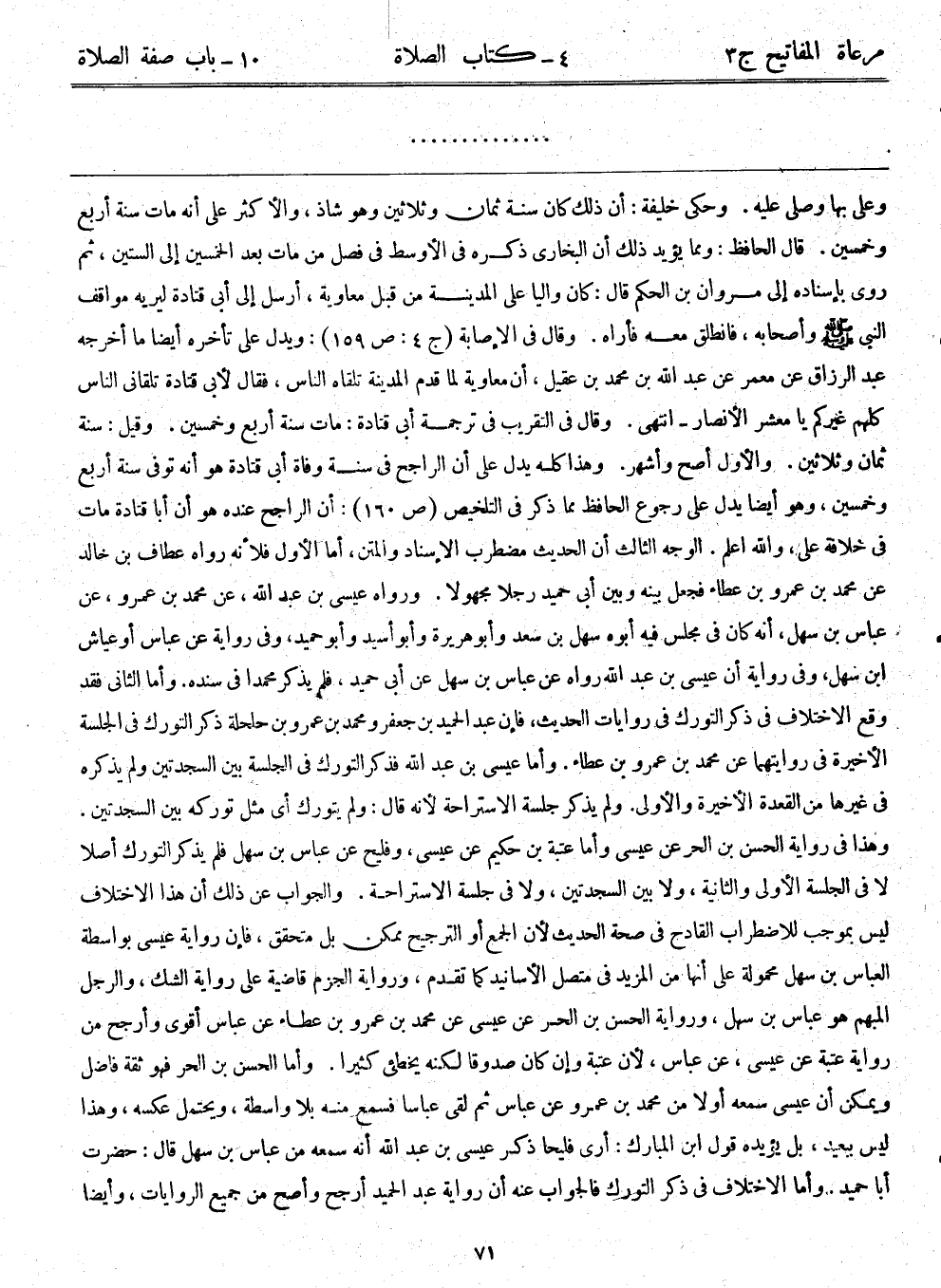 وعلي بها وصلى عليه. وحكى خليفة: أن ذلك كان سنة ثمان وثلاثين وهو شاذ، والأكثر على أنه مات سنة أربع وخمسين. قال الحافظ: ومما يؤيد ذلك أن البخاري ذكره في الأوسط في فصل من مات بعد الخمسين إلى الستين، ثم روى بإسناده إلى مروان بن الحكم قال: كان والياً على المدينة من قبل معاوية، أرسل إلى أبي قتادة ليريه مواقف النبي - صلى الله عليه وسلم - وأصحابه، فانطلق معه فأراه. وقال في الإصابة (ج4: ص159) : ويدل على تأخره أيضاً ما أخرجه عبد الرزاق عن معمر عن عبد الله بن محمد بن عقيل، أن معاوية لما قدم المدينة تلقاه الناس، فقال لأبي قتادة تلقاني الناس كلهم غيركم يا معشر الأنصار- انتهى. وقال في التقريب في ترجمة أبي قتادة: مات سنة أربع وخمسين. وقيل: سنة ثمان وثلاثين. والأول أصح وأشهر. وهذا كله يدل على أن الراجح في سنة وفاة أبي قتادة هو أنه توفي سنة أربع وخمسين، وهو أيضاً يدل على رجوع الحافظ مما ذكر في التلخيص (ص160) : أن الراجح عنده هو أن أبا قتادة مات في خلافة علي، والله أعلم. الوجه الثالث أن الحديث مضطرب والمتن، أما الأول فلأنه رواه عطاف بن خالد عن محمد بن عمرو بن عطاء، فجعل بينه وبين أبي حميد رجلاً مجهولاً. ورواه عيسى بن عبد الله، عن محمد بن عمرو، عن عباس بن سهل، أنه كان في مجلس فيه أبوه سهل بن سعد وأبوهريرة وأبوأسيد وأبوحميد، وفي رواية عن عباس أو عياش ابن سهل، وفي رواية أن عيسى بن عبد الله رواه عن عباس بن سهل عن أبي حميد، فلم يذكر محمداً في سنده. وأما الثاني فقد وقع الاختلاف في ذكر التورك في روايات الحديث، فإن عبد الحميد بن جعفر ومحمد بن عمرو بن حلحلة ذكر التورك في الجلسة الأخيرة في روايتهما عن محمد بن عمرو بن عطاء. وأما عيسى بن عبد الله فذكر التورك في الجلسة بين السجدتين ولم يذكره في غيرها من القعدة الأخيرة والأولى. ولم يذكر جلسة الاستراحة؛ لأنه قال: ولم يتورك أي مثل توركه بين السجدتين. وهذا في رواية الحسن بن الحر عن عيسى، وأما عتبة بن حكيم عن عيسى، وفليح عن عباس بن سهل فلم يذكر التورك أصلاً لا في الجلسة الأولى والثانية، ولا بين السجدتين، ولا في جلسة الاستراحة. والجواب عن ذلك أن هذا الاختلاف ليس بموجب للاضطراب القادح في صحة الحديث؛ لأن الجمع أو الترجيح ممكن بل متحقق، فإن رواية عيسى بواسطة العباس بن سهل محمولة، على أنها من المزيد في متصل الأسانيد كما تقدم، ورواية الجزم قاضية على رواية الشك، والرجل المبهم هو عباس بن سهل، ورواية الحسن بن الحر عن عيسى عن محمد بن عمرو بن عطاء عن عباس أقوى وأرجح من رواية عتبة عن عيسى، عن عباس؛ لأن عتبة وإن كان صدوقًا لكنه يخطئ كثيرًا. وأما الحسن بن الحر فهو ثقة فاضل ويمكن أن عيسى سمعه أولاً من محمد بن عمرو عن عباس ثم لقي عباساً فسمع منه بلا واسطة، ويحتمل عكسه، وهذا ليس ببعيد، بل يؤيده قول ابن المبارك: أرى فليحًا ذكر عيسى بن عبد الله أنه سمعه من عباس بن سهل قال: حضرت أبا حميد. وأما الاختلاف في ذكر التورك فالجواب عنه أن رواية عبد الحميد أرجح وأصح من جميع الروايات, وأيضاً