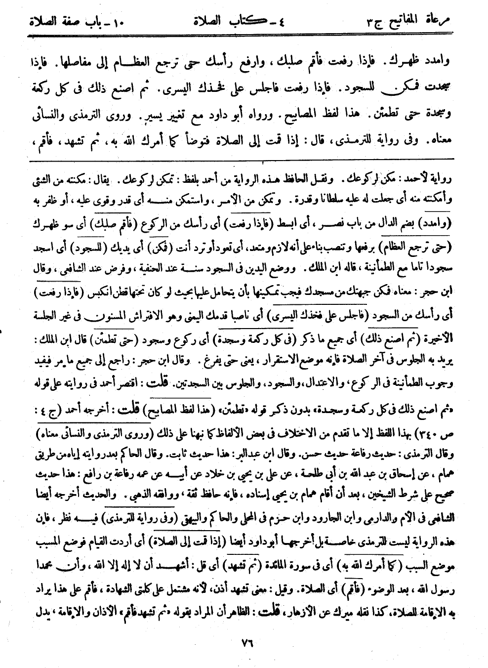 وامدد ظهرك. فإذا رفعت فأقم صلبك، وارفع رأسك حتى ترجع العظام إلى مفاصلها. فإذا سجدت فمكن للسجود. فإذا رفعت فاجلس على فخذك اليسرى. ثم اصنع ذلك في كل ركعة وسجدة حتى تطمئن)) . هذا لفظ المصابيح. ورواه أبوداود مع تغيير يسير. وروى الترمذي والنسائي معناه. وفي