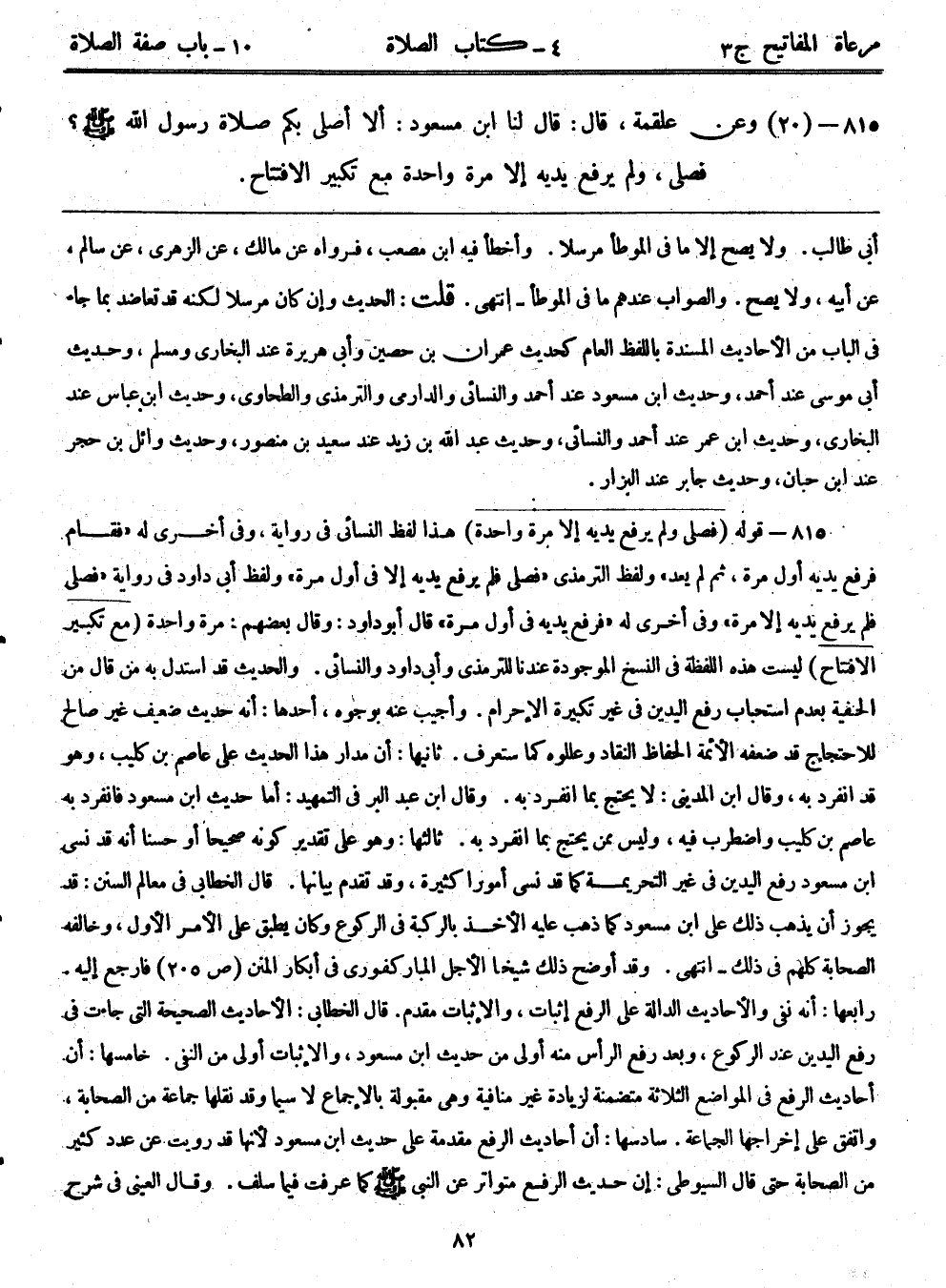 815- (20) وعن علقمة، قال: قال لنا ابن مسعود: ((ألا أصلي بكم صلاة رسول الله - صلى الله عليه وسلم -؟ فصلى، ولم يرفع يديه إلا مرة واحدة مع تكبير الافتتاح.