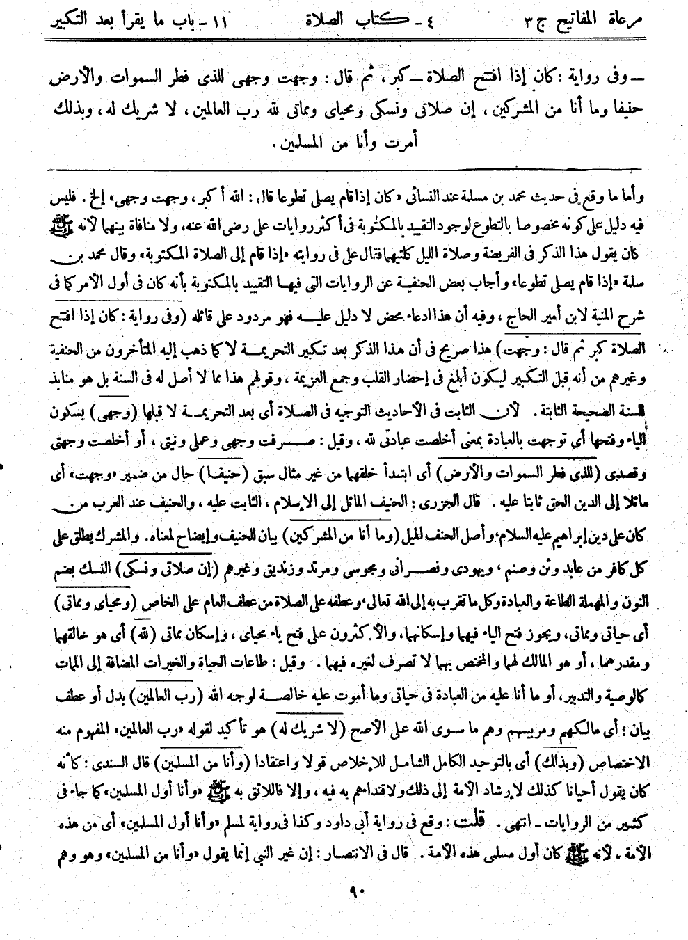 وأما ما وقع في حديث محمد بن مسلمة عند النسائي: "كان إذا قام يصلي تطوعا قال: الله أكبر، "وجهت وجهي" الخ. فليس فيه دليل على كونه مخصوصا بالتطوع لوجود التقييد بالمكتوبة في أكثر روايات علي رضي الله عنه، ولا منافاة بينهما؛ لأنه - صلى الله عليه وسلم - كان يقول هذا الذكر في الفريضة وصلاة الليل كلتيهما، فقال علي في روايته: "إذا قام إلى الصلاة المكتوبة" وقال محمد بن سلمة: "إذا قام يصلي تطوعا" وأجاب بعض الحنفية عن الروايات التي فيها التقييد بالمكتوبة بأنه كان في أول الأمر كما في شرح المنية لابن أمير الحاج، وفيه أن هذا ادعاء محض لا دليل عليه، فهو مردود على قائله. (وفي رواية: كان إذا افتتح الصلاة كبر ثم قال: وجهت) هذا صريح في أن هذا الذكر بعد تكبير التحريمة لا كما ذهب إليه المتأخرون من الحنفية وغيرهم من أنه قبل التكبير ليكون أبلغ في إحضار القلب وجمع العزيمة، وقولهم هذا مما لا أصل له في السنة، بل هو منابذ للسنة الصحيحة الثابتة. لأن الثابت في الأحاديث التوجيه في الصلاة أي بعد التحريمة لا قبلها. (وجهي) بسكون الياء وفتحها أي توجهت بالعبادة بمعنى أخلصت عبادتي لله، وقيل: صرفت وجهي وعملي ونيتي، أو أخلصت وجهتي وقصدي. (للذي فطر السموات والأرض) أي ابتدأ خلقهما من غير مثال سبق (حنيفاً) حال من ضمير "وجهت" أي مائلاً إلى الدين الحق ثابتا عليه، قال الجزري: الحنيف المائل إلى الإسلام، الثابت عليه، والحنيف عند العرب من كان على دين إبراهيم - عليه السلام -، وأصل الحنف الميل. (وما أنا من المشركين) بيان للحنيف وإيضاح لمعناه. والمشرك يطلق على كل كافر من عابد وثن وصنم، ويهودي ونصراني ومجوسي ومرتد وزنديق وغيرهم. (إن صلاتي ونسكي) النسك - بضم النون والمهملة - الطاعة والعبادة وكل ما تقرب به إلى الله تعالى، وعطفه على الصلاة من عطف العام على الخاص (ومحياي ومماتي) أي حياتي ومماتي، ويجوز فتح الياء فيهما وإسكانهما، والأكثرون على فتح ياء محياي، وإسكان مماتي (لله) أي هو خالقهما ومقدرهما، أو هو المالك لهما والمختص بهما لا تصرف لغيره فيهما. وقيل: طاعات الحياة والخيرات المضافة إلى الممات كالوصية والتدبير، أو ما أنا عليه من العبادة في حياتي وما أموت عليه خالصة لوجه الله. (رب العالمين) بدل أو عطف بيان؛ أي مالكهم ومربيهم وهم ما سوى الله على الأصح. (لا شريك له) هو تأكيد لقوله: "رب العالمين" المفهوم منه الاختصاص. (وبذلك) أي بالتوحيد الكامل الشامل للإخلاص قولاً واعتقاداً. (وأنا من المسلمين) قال السندي: كأنه كان يقول أحياناً كذلك لإرشاد الأمة إلى ذلك ولإقتدائهم به فيه، وإلا فاللائق به - صلى الله عليه وسلم - "وأنا أول المسلمين" كما جاء في كثير من الروايات – انتهى. قلت: وقع في رواية أبي داود وكذا في رواية لمسلم. "وأنا أول المسلمين" أي من هذه الأمة؛ لأنه - صلى الله عليه وسلم - كان أول مسلمي هذه الأمة. قال في الانتصار: إن غير النبي إنما يقول: "وأنا من المسلمين" وهو وهم