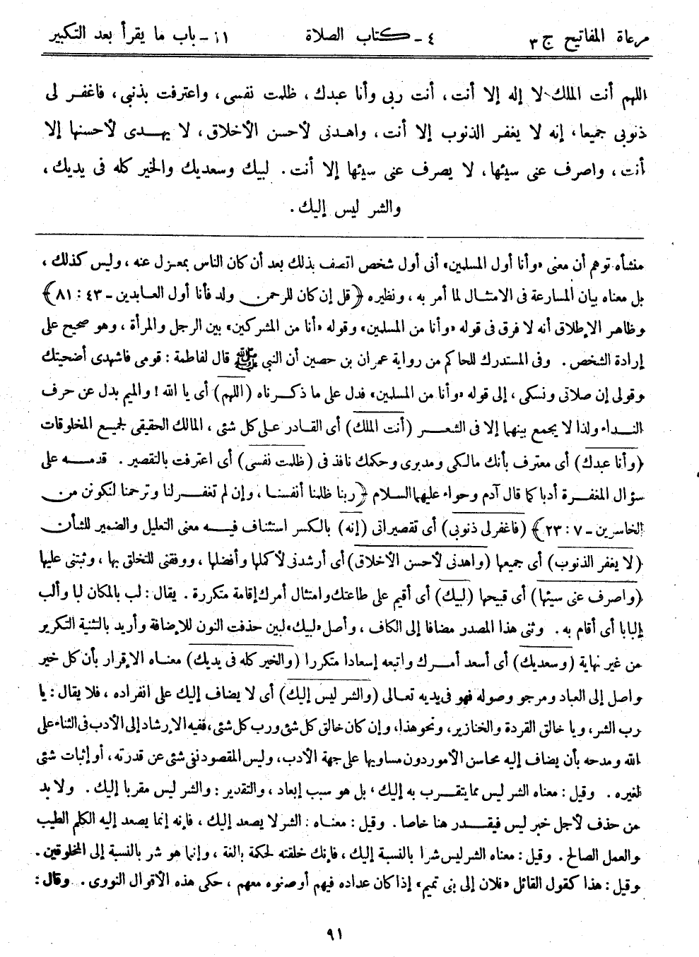 اللهم أنت الملك لا إله إلا أنت، أنت ربي وأنا عبدك، ظلمت نفسي، واعترفت بذنبي، فاغفرلي ذنوبي جميعاً، إنه لا يغفر الذنوب إلا أنت، واهدني لأحسن الأخلاق، لا يهدي لأحسنها إلا أنت، واصرف عني سيئها، لا يصرف عني سيئها إلا أنت. لبيك وسعديك والخير كله في يديك، والشر ليس إليك.